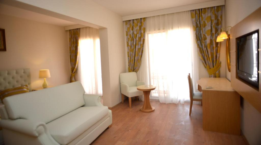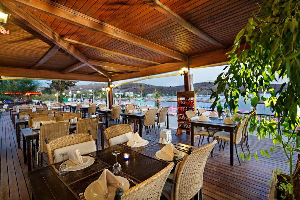 Отель понравился. Немаленькая территория, первая линия, свой пляж. Приехали часов в 10 утра, оставили вещи, позавтракали, вернулись, и нам сразу же дали ключи от номера. Территория чистая, ухоженная, есть бар у бассейна. У нас был большой номер на первом этаже возле ресепшн, убирались каждый день, за неделю полотенца меняли несколько раз. Питание - все качественно и вкусно, немного однообразно. Но всегда было, что выбрать. Вино и пиво на обед и ужин. Фрукты - яблоки, виноград, апельсины. Выбор сладкого скромненький. К плюсам бы отнесла расположение, до мельниц можно прогуляться пешком, чтобы посмотреть закат. До крепости либо пешком минут 30, либо на такси всего за 30-35 лир. Рядом магазины, кафешки. Единственный, на мой взгляд, минус - это отсутствие крыши в ресторане, два раза вечером шел дождь и была серьезная проблема. Над несколькими столиками есть навес, который протекает, и этих столиков, конечно, на всех не хватит. Пришлось брать еду и бежать в номер под дождем. Наверно летом дождь в этих местах большая редкость, на это, видимо расчет. WI-FI бесплатно, но ловит только у ресепшн.