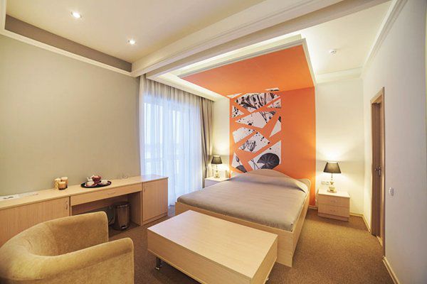 В номере: ванна, туалет, фен, ТВ, холодильник, кондиционер, сейф, двуспальная кровать, мягкая мебель.
