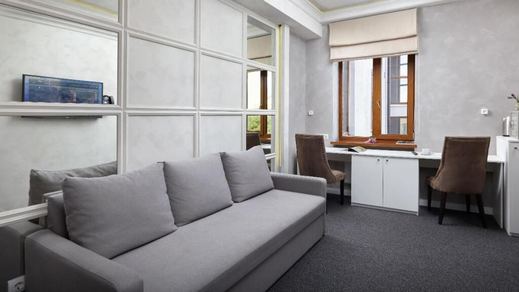 4-местный 2-комнатный полулюкс: 2-комнатный, 30 кв. м, количество гостей в номере 2+2 (доп. место раскладной диван), двуспальная кровать, диван-кровать