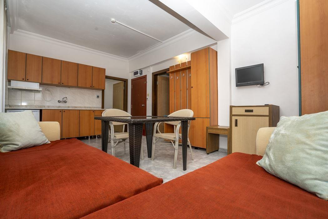 Отдыхали в этом отеле 2 недели с конца июля по 9 августа, начитавшись плохих отзывов, не ждали ничего хорошего, приготовились к худшему, на наше удивление отдых прошел замечательно, большие апартаменты, да, с уборкой не заморачиваются, но если оставлять чаевые, уберут тщательнее. Брали кондиционер на 2 недели вышло 70 долларов, до моря 15м неспешным шагом, нас это не напрягало)), выходили к 7 пляжу, море волшебное, чистое, теплое) Рядом в 5 минут Мигрос, в 50метрах рыбный рынок, на котором мы заказывали всевозможную рыбу, где нам ее делали или на гриле, или на сковороде, по вторникам работает базар, объелись арбузами, дынями, черешней. По вечерам выходили в центр, гуляли по главной улице, напокупали футболок и всевозможных вещей в LTB по 200р, были какие то нереальные скидки, ели во всевозможных кафешках. Выбрала бы я этот отель апартамент в следующий раз, да!!! Но мы были без детей, может с детьми и далековато, нам было хорошо прогуляться до моря и после.