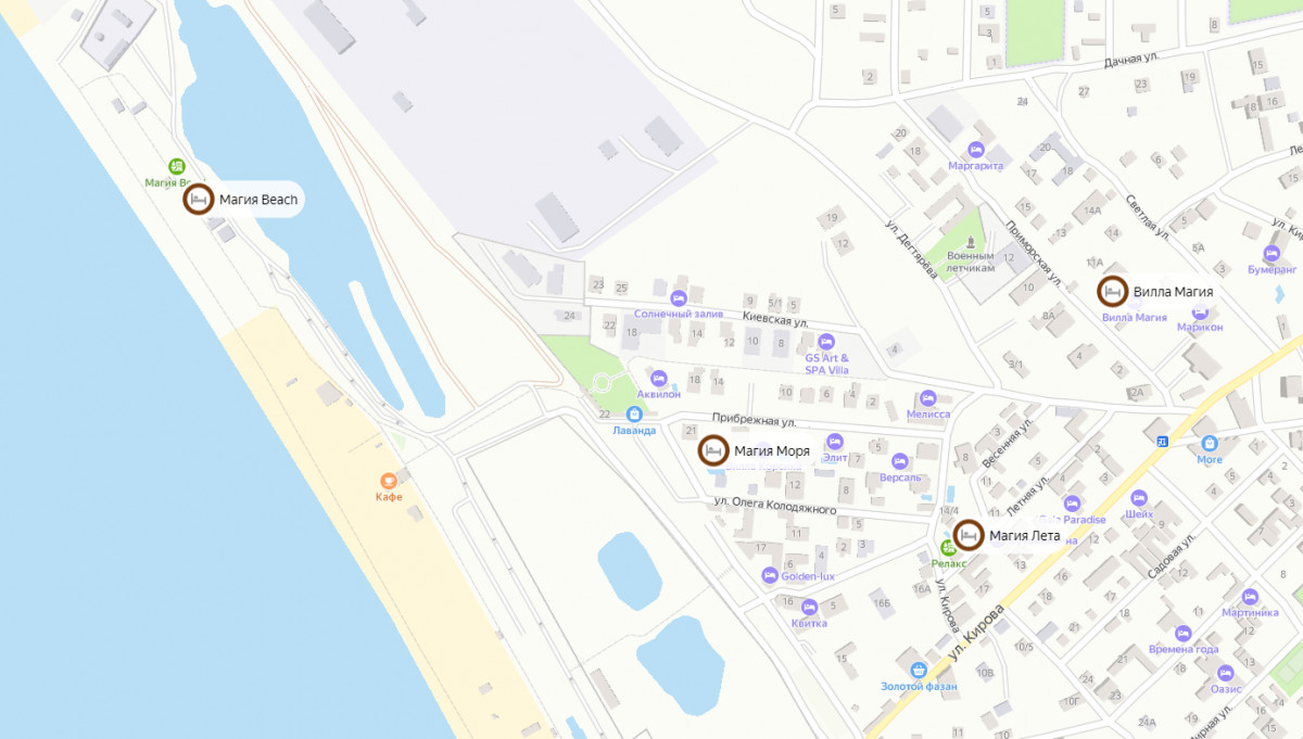 «Вилла Магия»: Республика Крым, Новофедоровка, Приморская ул., 7. «Магия Лета»: Республика Крым, Новофедоровка, Летняя ул., 15. «Магия Моря»: Республика Крым, Новофедоровка, Прибрежная ул., 22. «Магия Beach»: Республика Крым, Новофедоровка, рядом с пляжем.