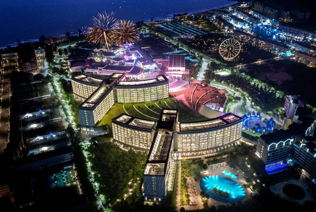 В настоящее время отдыхаем в этом отеле. Он шикарен. Огромная территория с выходом на чистейший пляж, собственный аквапарк, казино, торговый центр. Сам отель новый. Как сказала нам русскоговорящий гид, его запустили только летом 2018 года. Всё новое, чистенькое. Мы купили тур, где включены только завтраки. Купить еду негде. Рядом нет альтернативных кафе. Только в ресторане, с доставкой в номер. Это дорого. Таких цен, как в Тае, здесь нет. Здесь суп - 350 руб, картошка фри - 300 руб, пицца - 550 руб. Лучше брать полный пансион. В шаговой доступности Винперл лэнд. Интересно, увлекательно, но сходить туда стоит не более 1 раза. На территории ничуть не хуже аквапарк. Вай фай ловит хорошо и даже на пляже.