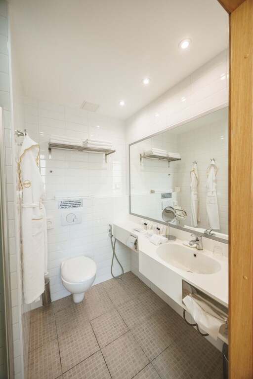 Апартаменты: 47 кв. м. Номер двухуровневый: нижний уровень номера — гостиная с небольшой кухней и сан. узлом, верхний уровень — спальная комната с выходом в сан. узел. Две односпальные или одна двуспальная кровать с ортопедическими матрасами, гидромассажная ванна, инфракрасная сауна, дополнительный сан. узел, подогреваемые полы, оборудованная кухня (плита, микроволновая печь, чайник)