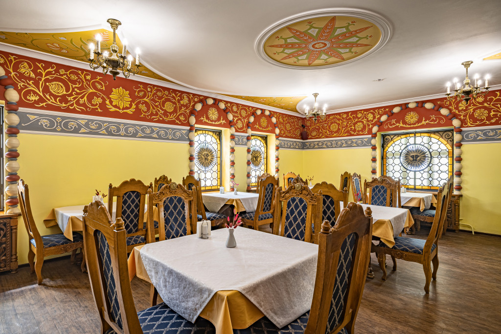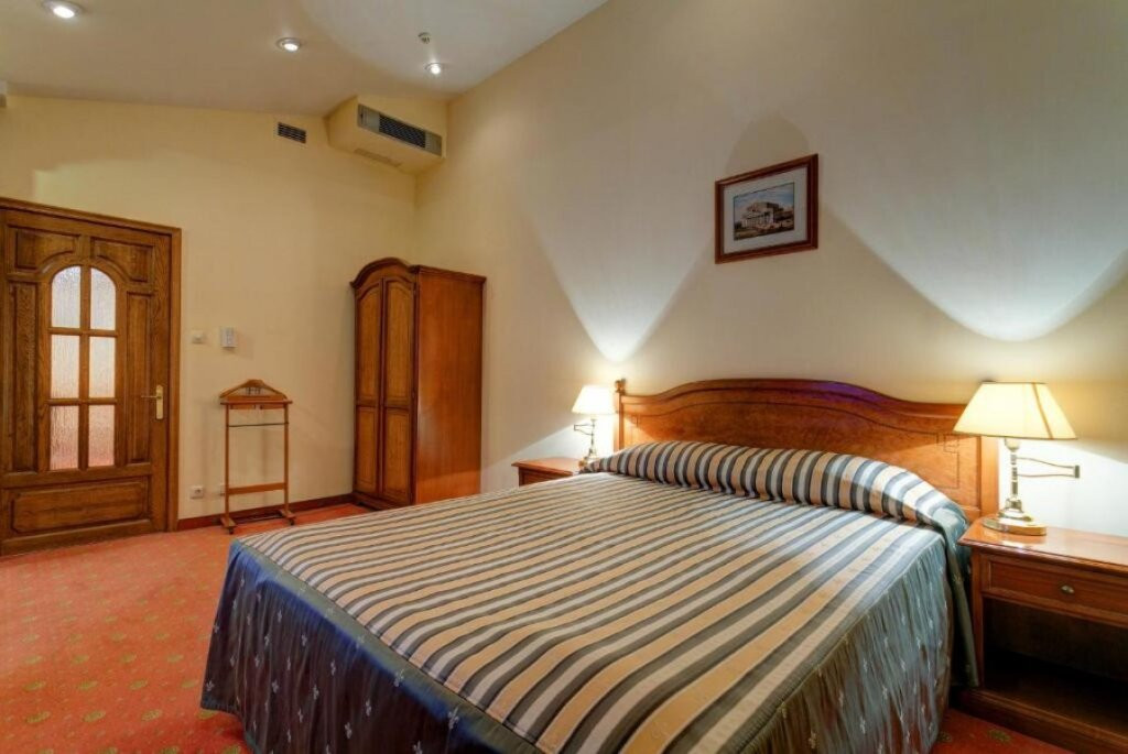 Люкс (около 45 кв. м, 2 комнаты, двуспальная кровать, тумбы, диван, кресло, стулья, зеркало, комод, шкаф, журнальный столик, чайный набор, санузел)