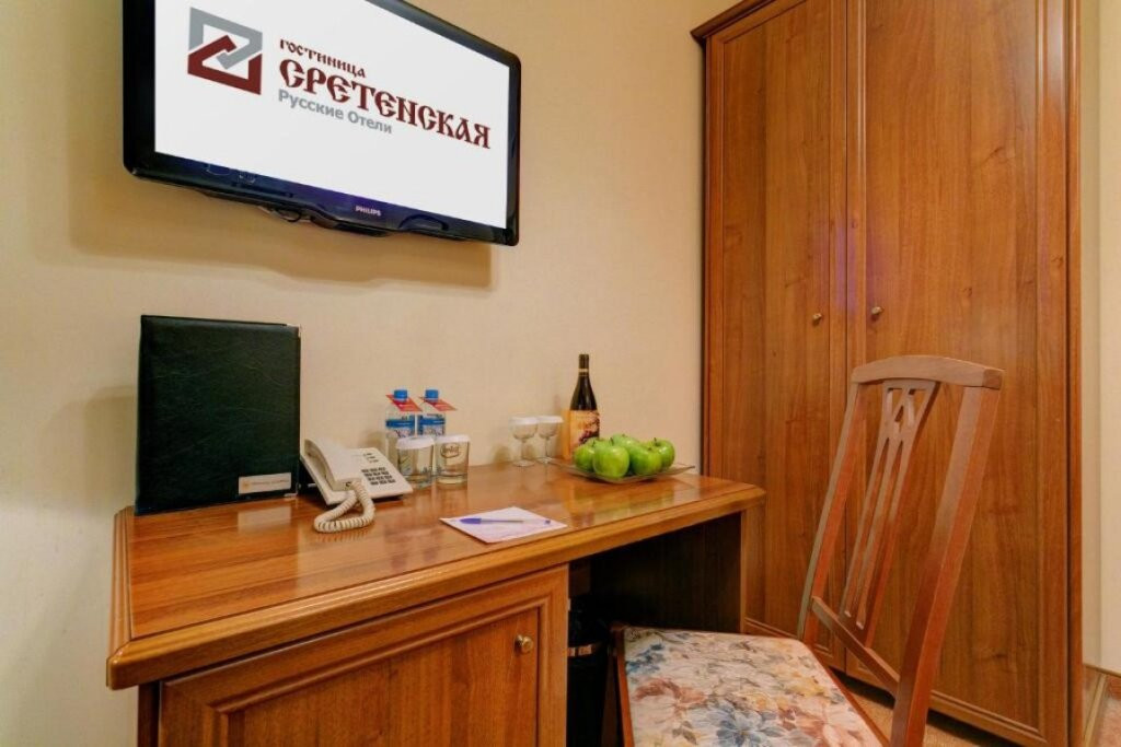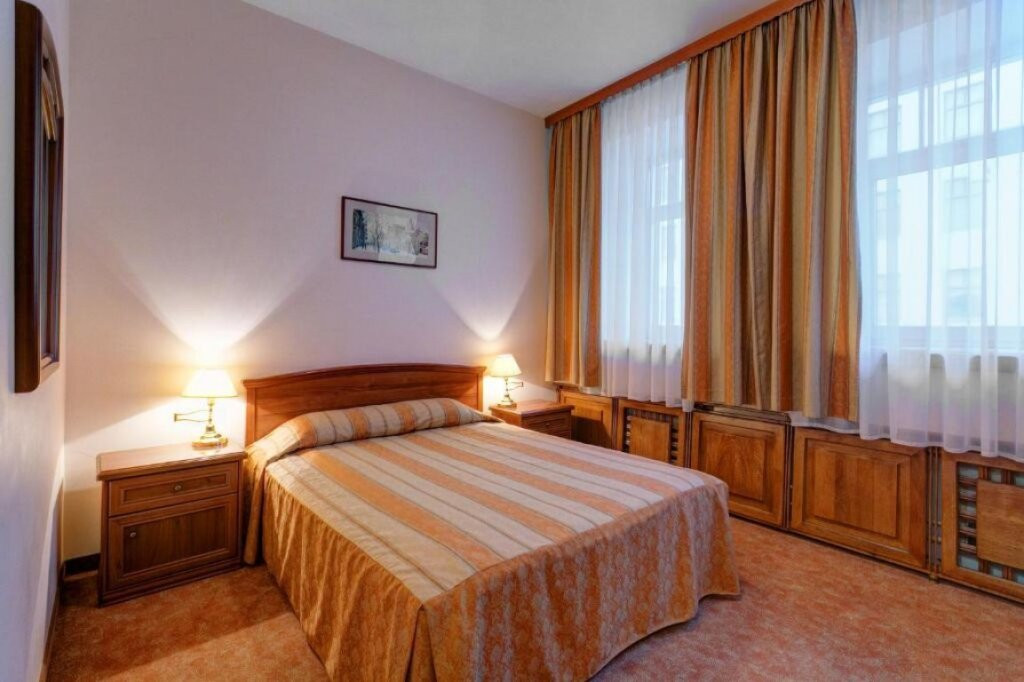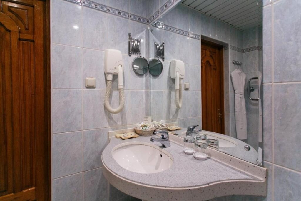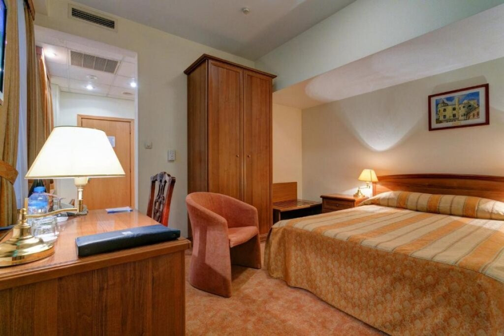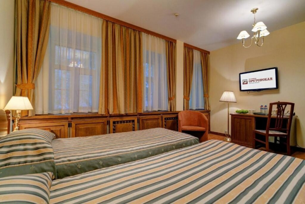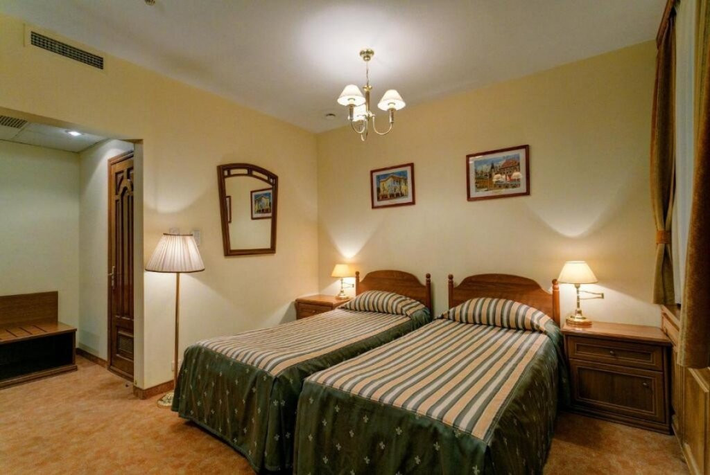 Улучшенный (около 28 кв. м, две односпальные кровати, письменный стол, кресло, чайный набор (по запросу), зеркало, шкаф, санузел; номер с небольшой зоной отдыха)