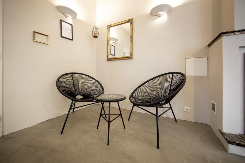 Отель состоит из двух соединенных зданий с общим входом, рецепцией и террасой: трехэтажное здание, без лифта — семейный апарт-отель, который предлагает студии и апартаменты; пятиэтажное здании с лифтом — стандартные номера, некоторые с балконами. Студии и семейные апартаменты оснащены мини-кухней с холодильником, плитой и посудой.