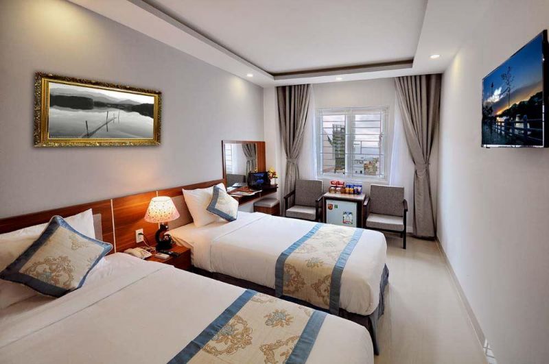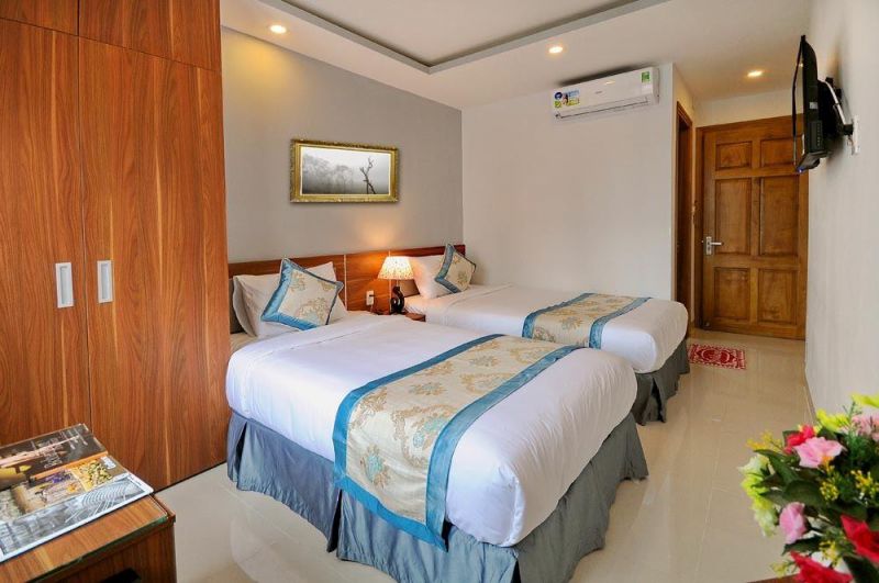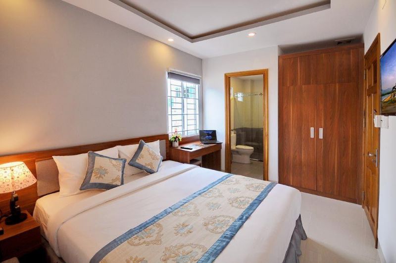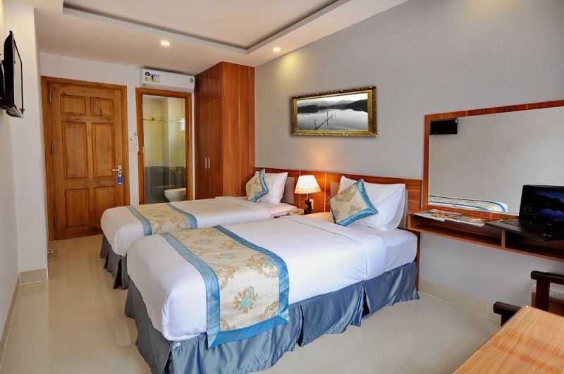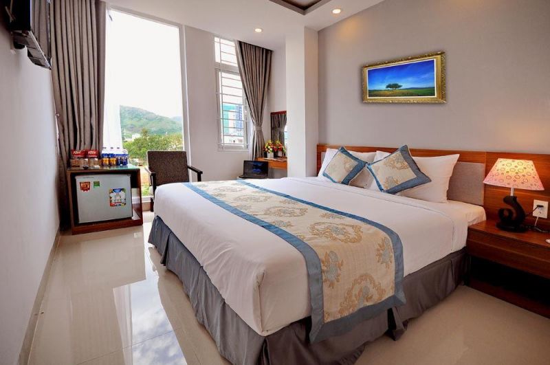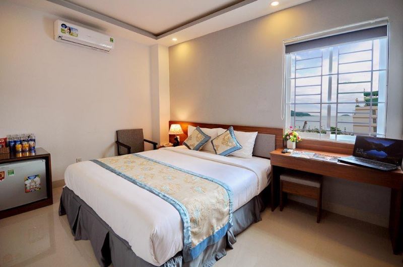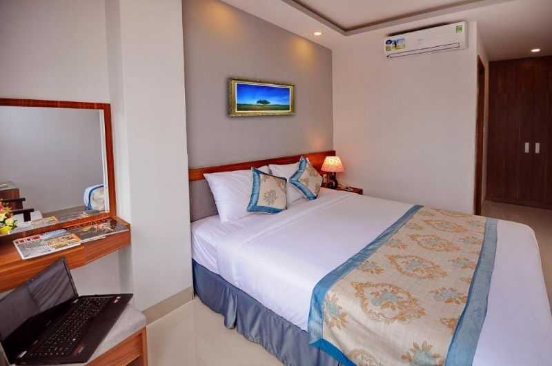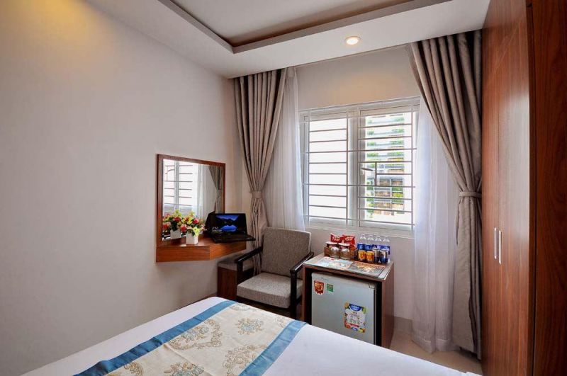 Добрый день. Отдыхали в сентябре 2018 г., приехали в отель в 10 утра и нас сразу заселили (502 и 802 номер). Окна выходили на противоположную сторону от стройки, поэтому она нам не мешала. Окна в номере не мытые, шторы грязные. Есть шкаф и много вешалок для одежды, кондиционер, чайник, фен, холодильник, телевизор (из российских каналов показывает только "Первый"), сейф с электронным замком (все ценные вещи оставляли в нем, ничего не пропало), платный мини-бар. Завтраки в отеле вполне устраивали, голодными не остались, даже когда опаздывали. Талоны на завтрак каждое утро брали на ресепшене. Персонал плохо понимает по-русски, выручал он-лайн переводчик в телефоне, один из охранников немного говорит и понимает русский, он помогает, если нужно сейф перекодировать или кондиционер вырубился. При заселении забрали загранпаспорта, вернули в день отъезда после проверки номера. Ежедневно убирались в номере, добавляли шампунь, мыло, одноразовые зубные щетки с пастой и две бутылочки воды, постельное белье меняют только, если попросишь, полотенца меняли каждый день (на номер выдают всего два полотенца). Горячая вода в отеле только днем, утром и вечером - теплая, Ничего сладкого на столе не оставляйте, через три минуты появляются очень мелкие муравьи в большом количестве, других насекомых не встречали. Воспользовались услугой глажки одежды, т.к. утюг не дают, остались недовольны, гладильной доски нет, гладят на простыне на полу, это я узнала, когда мне разрешили самой погладить после двух попыток неудачной глажки персоналом отеля, но деньги с меня все равно взяли (7000 донгов за одну вещь, 21 руб.). Ключи от номера всегда оставляли на ресепшене, с собой не таскали. В целом, отель нормальный, если учесть, что мы в нем только ночевали. Нас предупредили, что байкеры сдергивают сумки, поэтому телефон и деньги носили в карманах, или оставляли в сейфе. Пляж в пяти минутах от отеля, дно каменистое, мы уходили чуть дальше , шезлонги и зонт платные, к ним выдают полотенца (40000 донгов одно место, будут предлагать дороже, торгуйтесь, время пользования не ограничено, мы уходили пообедать, предупреждали, что вернемся). Рядом с отелем спа-салон, очень хорошо делают массаж, несколько кафе, цены примерно одинаковые, на соседней улице в кафе "Морячок" русская кухня.