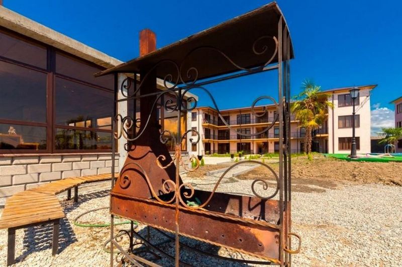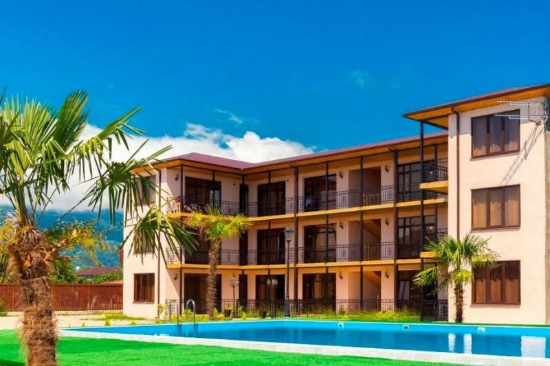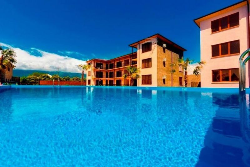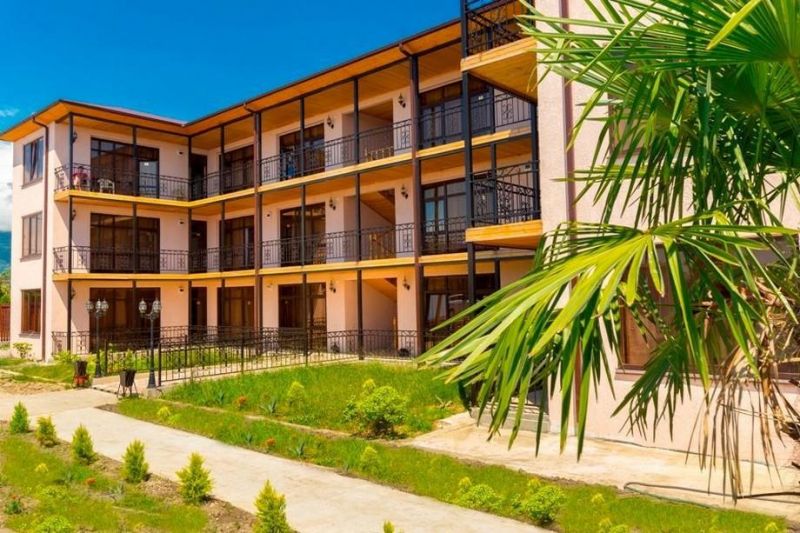 Отель находится в поселке. Это первое,что вы должны понимать. Это не Гагры,это не Пицунда!это не Сухум,это ПОСЁЛОК,где вышел за ворота отеля и попал в деревню. Отель расположен на центральной улице Туманяна,вдоль улицы кафе,столовые,шашлычная,торговые ряды,улица усыпана торговцами всего и вся,купить сможете от иголки до кресла. Очень важная инфа,есть аптека,она прям около моря. Теперь об отеле.персонал хороший,кроме блондинки лет за 40, хамка. Есть корпуса двухэтажные ,с комнатами,а есть домики,по возможности выбирайте домики,они стоят отдельно,со своей верандой,столиком и стульями,Санузел оказался грязным,сантехника вся в разводах,нет ни мыла,ни шампуня. Только полотенца и белье постельное. Вайфай не работает в помещении,в любом!Только улица ,ловит хорошо прям только у бассейна. Бассейн не маленький ,утром его чистят,но борты внутри все в грязи,можно рисовать на грязи,в чем проблема помыть ? Лежаки почти все треснутые ,но их достаточно,почти всего были в доступе,при загруженном отеле. Из питания там только завтраки,за неделю меню не менялось,каждый день одно и тоже,только салата два чередовались,столов катастрофически не хватает,люди стоят с подносами и ждут,пока другие поедят,женщины необъятных размеров толкаются и ругаются за очередь,боясь,что им не достанутся сосиски,очередь занимают с 7 утра . Поверьте,придя в 9 сосиски будут на месте как и салат. Очень вкусный творог со сметаной,персонал сам накладывает ,не жадничают,тарелки полные как и женщины. По вечерам люди тусуются у бара ,там и бассейн ,можно заказать кофе ( 120 р) кстати вкусный,коктейли безалко от 300,играет неплохая музыка, обстановка приятная. Территория достаточно красива по сравнению даже с дорогим отелем у берега,один раз забрели коровы,но коровы там везде как и собаки,поэтому,если вы не любите животных не приезжайте в Абхазию,не мотайте себе нервы. На территории отеля живут собаки и кошки,нет,ради вас их не выгонят. Ставлю 4 из 5