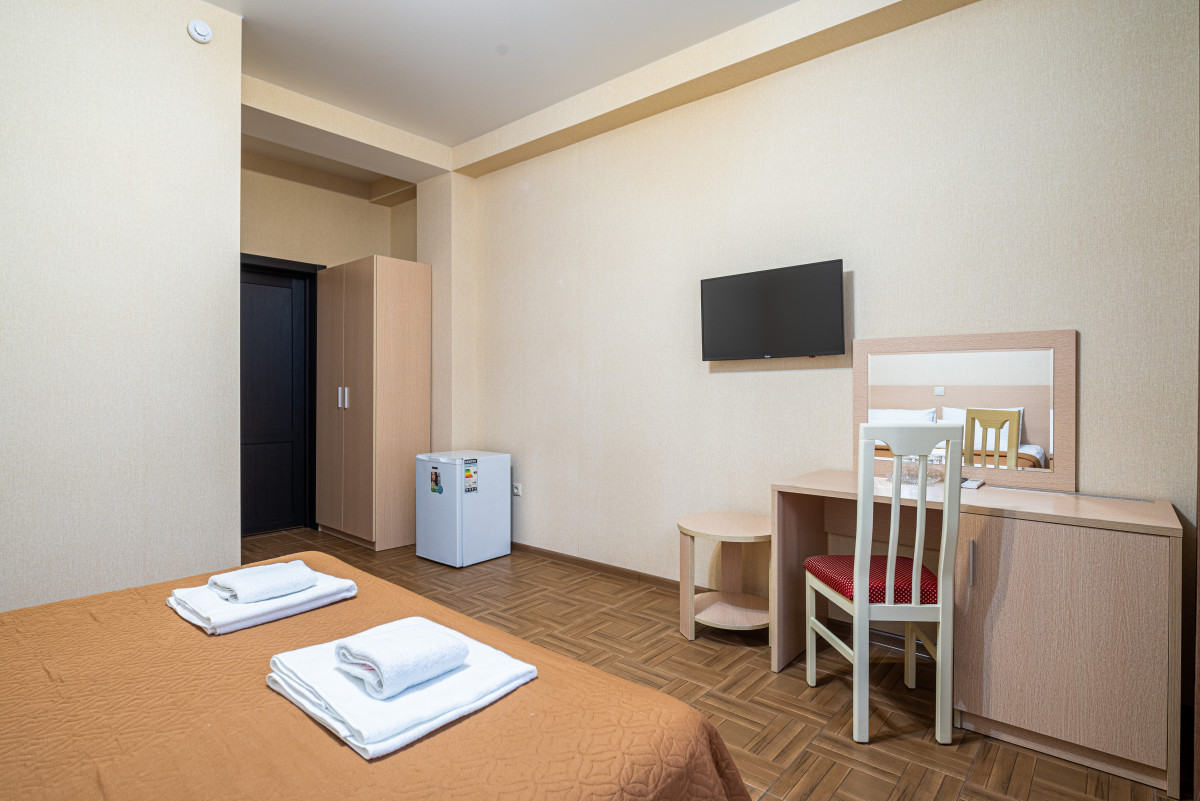 Ездила в декабре, отель и номер хороший, полотенца меняли, зубные щётки, тапочки, шампуни всё было. Холодильник в номере, ТВ, чайник на этаже. По номеру претензий нет. Персонал приветливый. Желание чтоб была микроволновая печь на каждом этаже, чтоб не ходить всём на первый, и поставить кулер с водой или фильтр для воды. А так остальное всё нормально было.