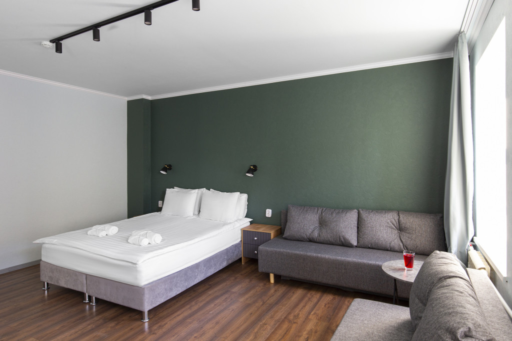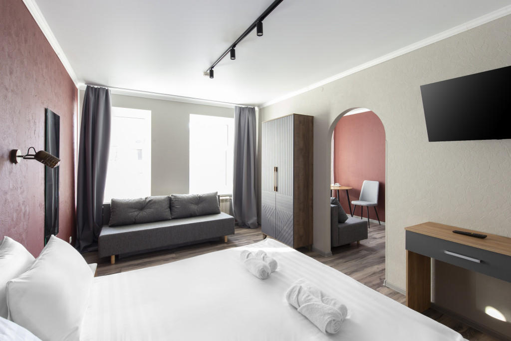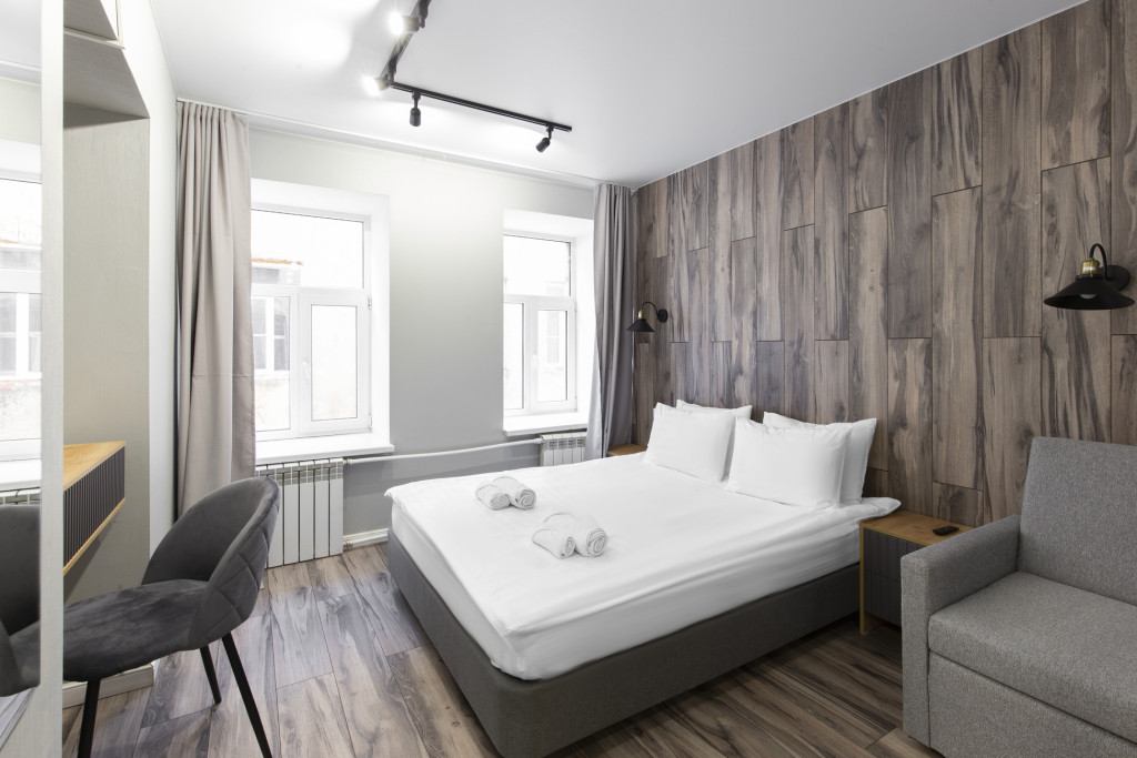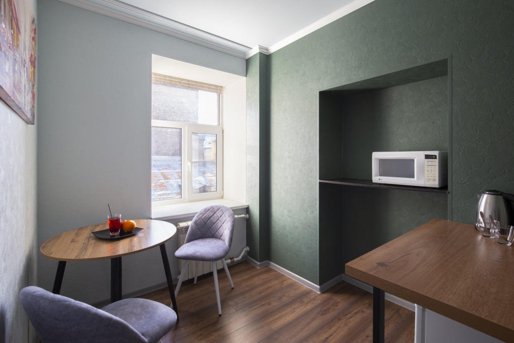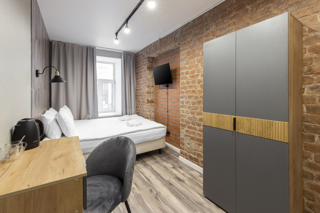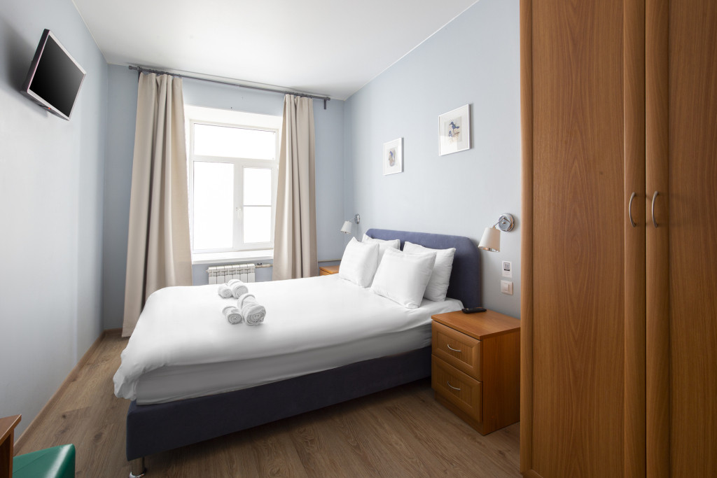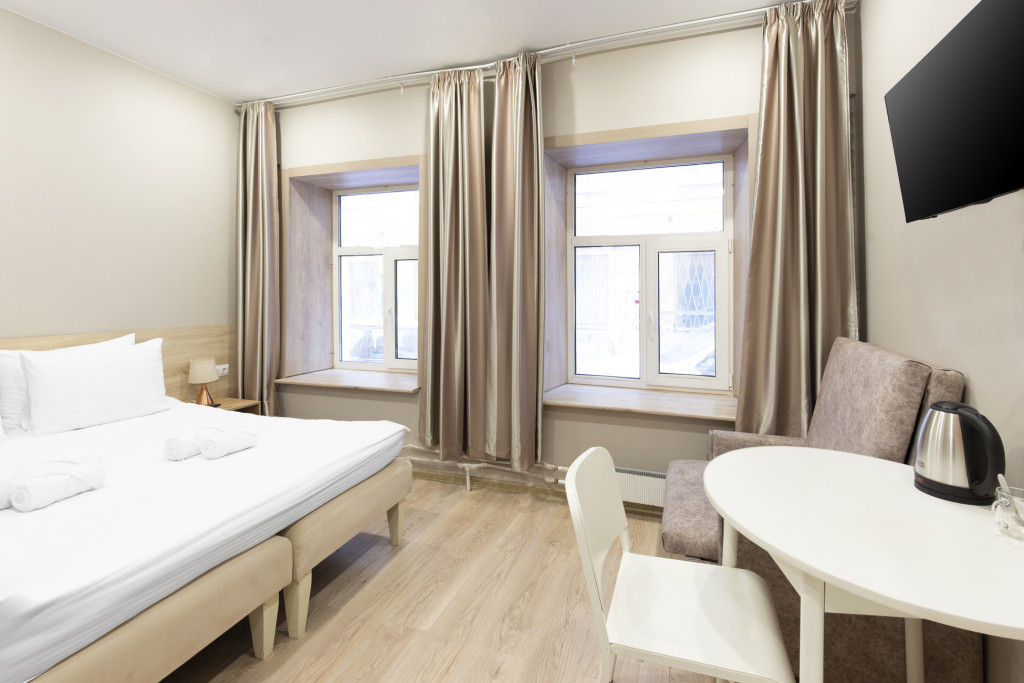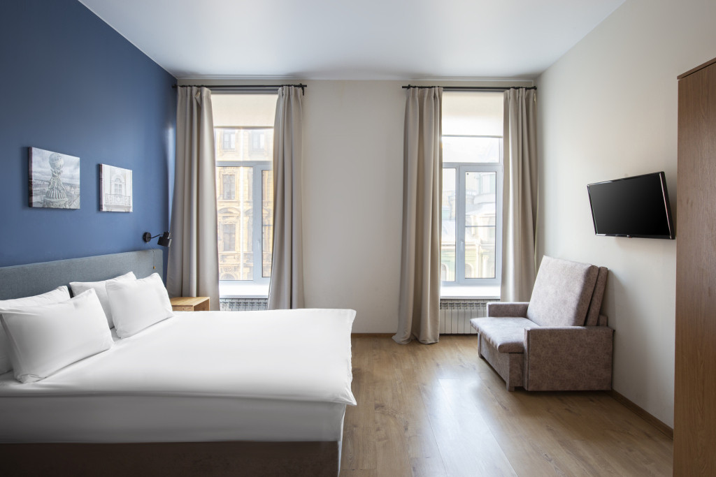 Отелем назвать язык не поворачивается. Заявлен как 3 звезды, на вывеске у входа 2. На самом деле я бы не дала и 1. Из положительного, только место расположения. До метро Владимирская и Достоевского примерно 300 м. До Неского пр. 700 м. 1) При регистрации на стойке бегал таракан, сказали администратору, никакой реакции. 2) Покупали комфорт 20-25 кв.м, турагент в заявке указал, что нужны две односп кровати, номер подтвердили. Заселили в стандарт (номер 106 15 кв.м) с дной двусп.кроватью и кресло-кровать. Места в номере практически нет. Над телевизором убытый таракан и по всей комнате на светлых обоях пятна от убитых насекомых. Под телевизором столик, лучше не задевать, шатается. Номер вроде с ремонтом, но не доделано тут и там по немногу. Портит общий вид. Плинтус совсем не моют. Белый плинтиус весь в пыли, серый. Окна и полоконники грязные. Шторы грязные. Дверь в туалет с душем не закрывается. Слышимость как-будто у тебя над ухом говорят, и ходят, и т.д. Отопление не работает. Но есть эл.обогреватель. Мне нормально было. Подруга мерзла. Попросила дополнительное одеяло - искали, не нашли. 3) Уборка - только меняют мусорные пакеты. За все время 7 дней не помыли ни пол, ни унитаз, ни раковину, пыль не протирают. 4) На фото при бронировании на площадках и на сайте отеля -это не он. Это здание напротив. Фасад отеля неприглядный. 5) Лесница на ресепшен грязная. 6) В номере нет холодильника это большой минус. Есть эл.чайник и 2 кружки. 7) В отзывах прочитали, что есть небольшая кухня где-то на этажах с микроволновкой. Администратор сказал - нет. Искать не пошли. На нашем этаже был кулер с хол и гор водой. Утюга и глад.доски нет. 8) Выдают 2 больших полотенца, 2 маленьких и 1 для ног. Меняют через 5 дней. Почемуто нам частично поменяли только большие. Пошли спрашивать почему - кончились. На след.день поменяли остальные по просьбе. Постельное тоже через 5 дней поменяли. Рядом много кафе и магазинов. Поедем ли еще раз в этот отель - думаю, что нет!
