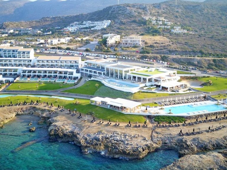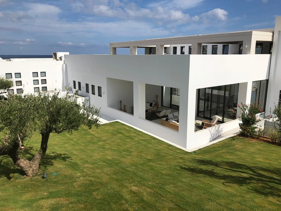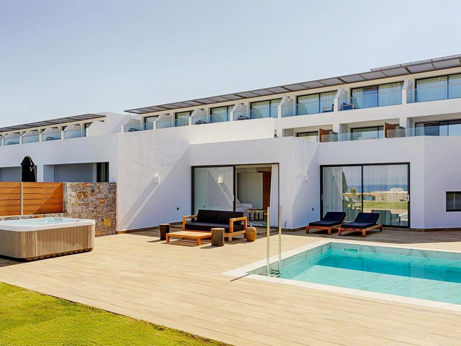 Abaton Collection Suite Pr.Pool (вид на море с верхнего этажа, двухуровневый номер открытой планировки, спальня на нижнем уровне, гостиная на втором уровне, осн. кровать — двуспальная или 2 односпальные, доп. — софа, индивидуальный бассейн, патио, макс. 3 чел.+инф., 45 кв. м. (общая площадь 126 кв. м.))