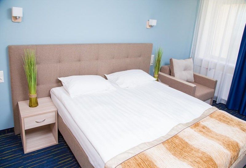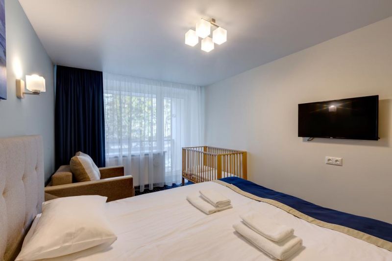 Suite: Двухкомнатный номер, каждая комната с отдельным балконом. Возможно размещение в номере с одной (DBL) большой кровалью. В номере имеется раскладной двухместный диван и раскладное кресло, а также мини-кухонный уголок