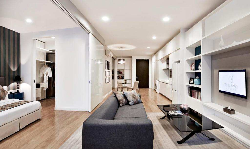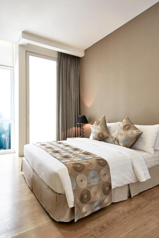 1 Bedroom Deluxe — 84 кв. м, люкс с 1 спальней с двуспальной кроватью, гостиная с диваном, мини-кухня с вытяжкой, плитой, микроволновой печью и холодильником с обеденным столом, функциональное пространство для работы или учебы со столом и стулом, гардеробная комната, с панорамным видом на город. В ванной комнате душ. Макс. 3 взрослых.