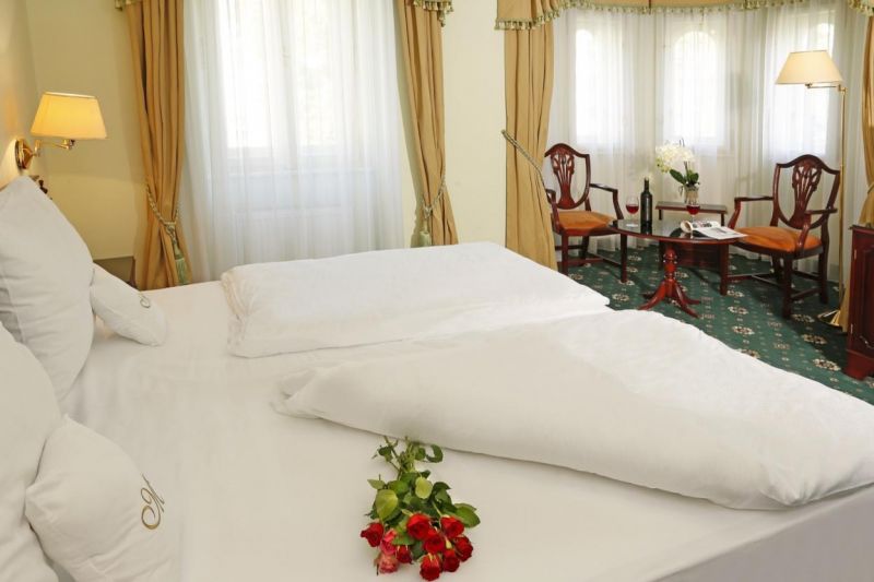 В самом престижном районе Карловых Вар, называемом Вэст-Энд. Это фешенебельный район, его ещё называют районом роскошных вилл, где располагаются в основном такие же отели. Он образован тремя улицами, которые направляются к источникам или просто в центр. До ближайшей колоннады с лечебными питьевыми термоминеральными источниками 450 метров.