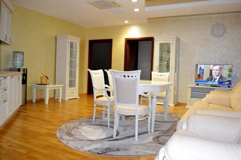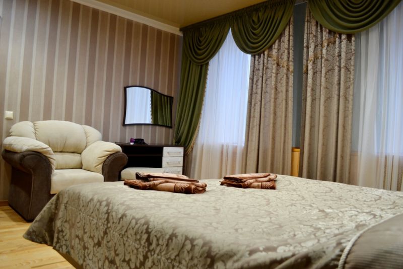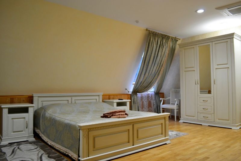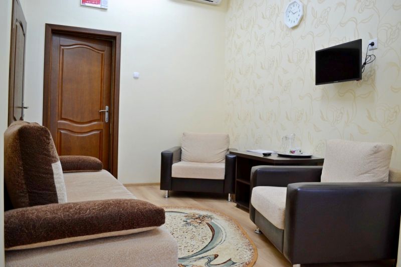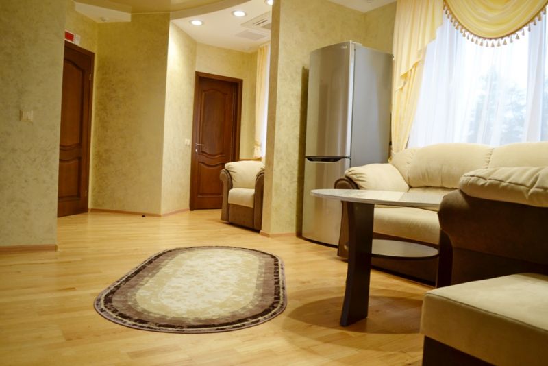 2-местный 2-комнатный люкс (макс. 2+2 чел., ванна, туалет, умывальник / Wi-Fi, балкон, кондиционер, мини-холодильник, тв, телефон, чайник, 1-спальные кровати, туалет). Доп. место — раскладывающийся диван, может быть установлена без ограничения по возрасту.