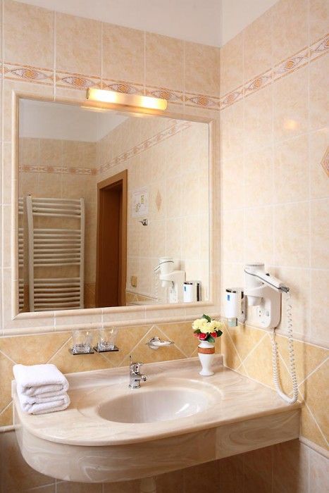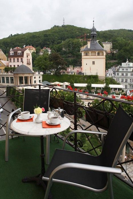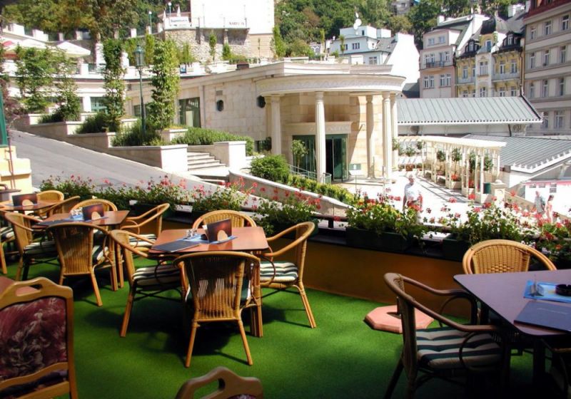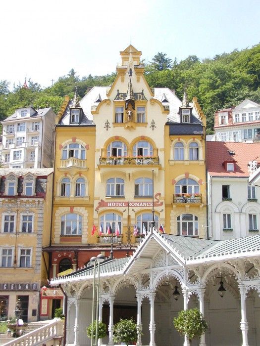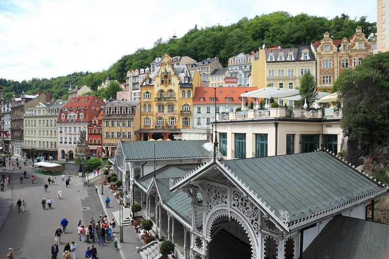 В самом центре Карловых Вар напротив Гейзеровой колоннады и лечебницы "Замковые Лазне".