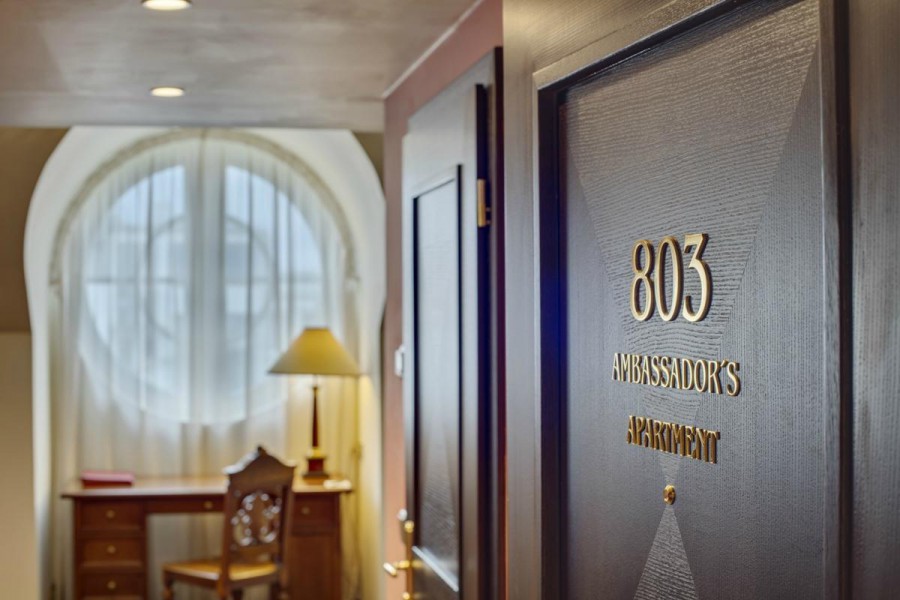 Ambassador‘s Apartment (89кв.м., роскошный люкс, спальня, большая гостиная с большим угловым диваном, круглый стол из оникса, удобный как для проведения деловых встреч, вид на Кеплер-стрит)