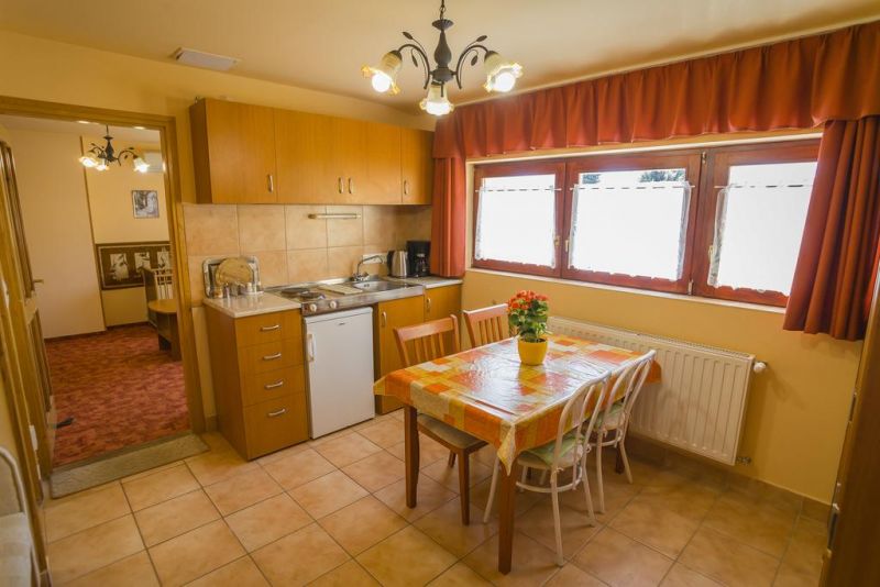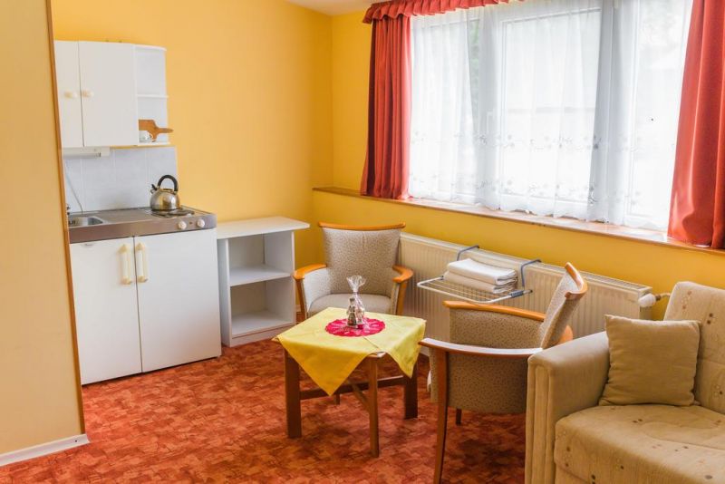 Ground Floor Apartment (расположен на 1 этаже, двери апартаментов выходят на большую запирающуюся террасу, спальня с 2 или 3 кроватями, небольшая кухня: обеденный стол, холодильник, плита, кофеварка, столовые приборы, посуда)