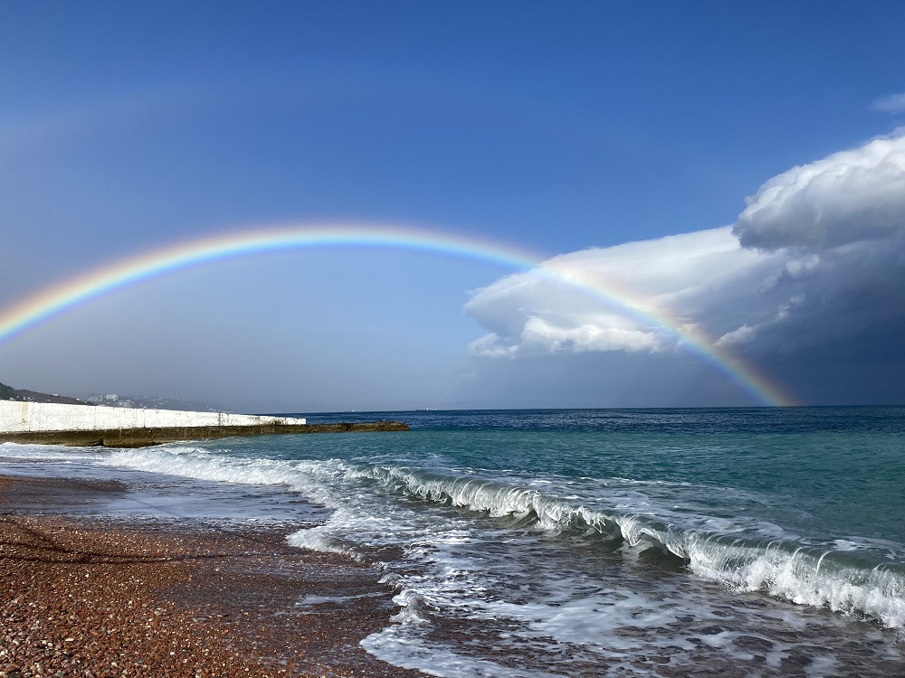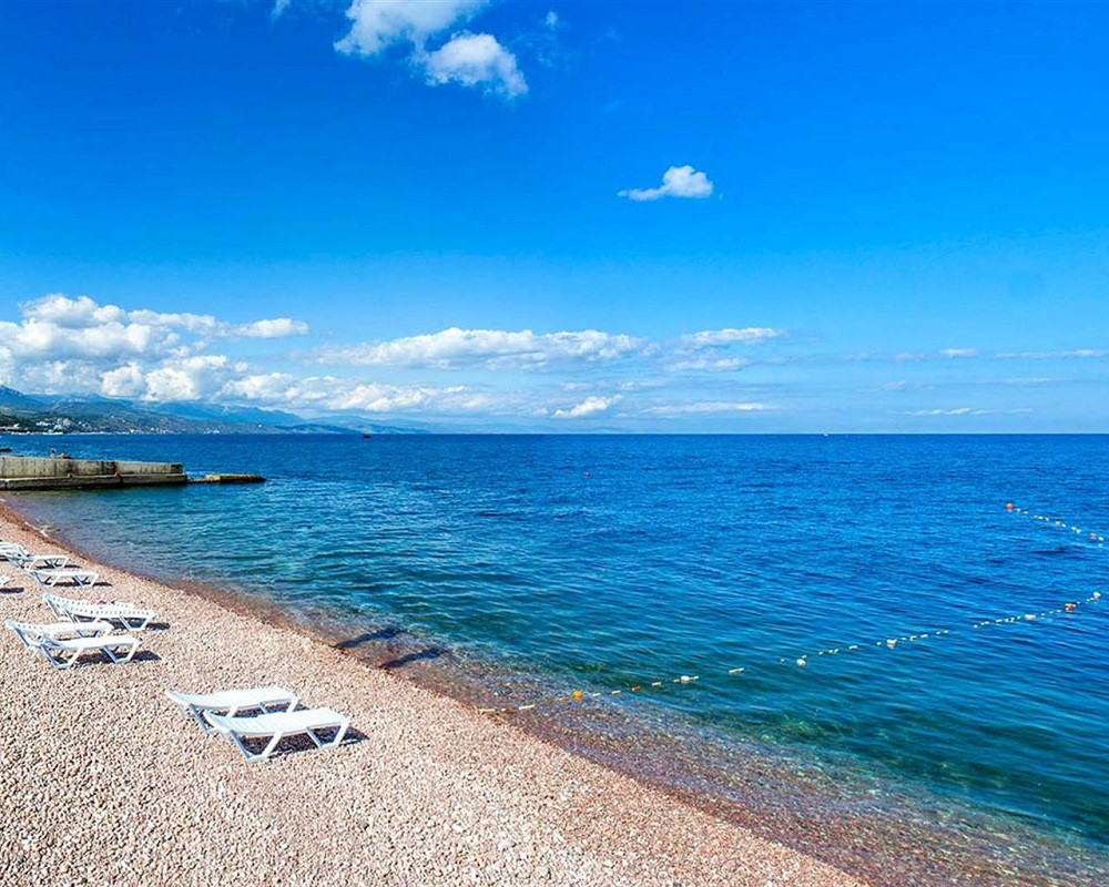 галечный пляж санатория Морской уголок, им пользуются несколько отелей