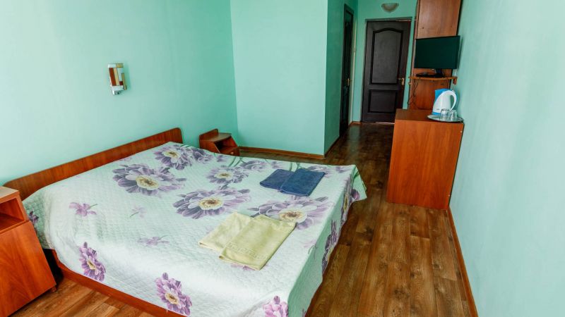 - на третьем, четвертом и пятом этажах одно и 2-комнатные стандартные номера со всеми удобствами (телевизор, холодильник, кондиционер). Вход в номера из коридора. В номерах большая двуспальная кровать, раскладной диван (как дополнительное место), совмещенный санузел, душевая кабина, биде. В номерах большие балконы с набором пластиковой мебели для душевного отдыха в кругу друзей и семьи