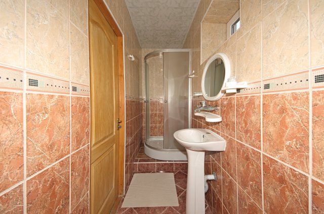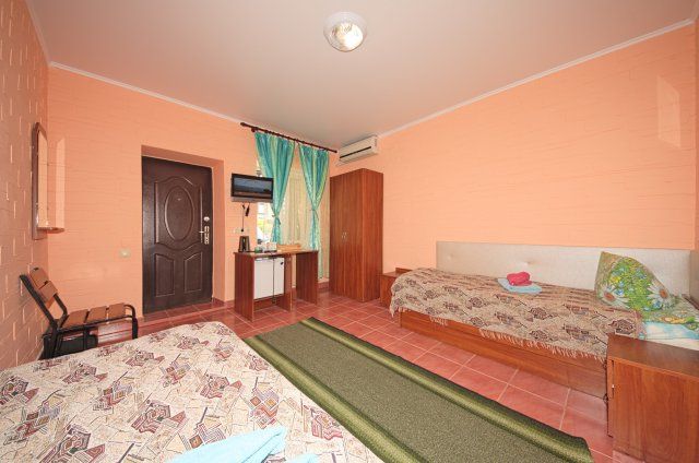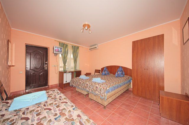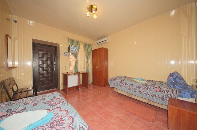 Стандарт 2-местный. Площадь 14-16 кв.м. В номере две раздельные кровати, все удобства (душ, умывальник, туалет), горячая и холодная вода, холодильник, телевизор, кондиционер. Уборка номера один раз в три дня. 6 номеров, расположены на 1 этаже. Возможно 1 доп. место - еврораскладушка