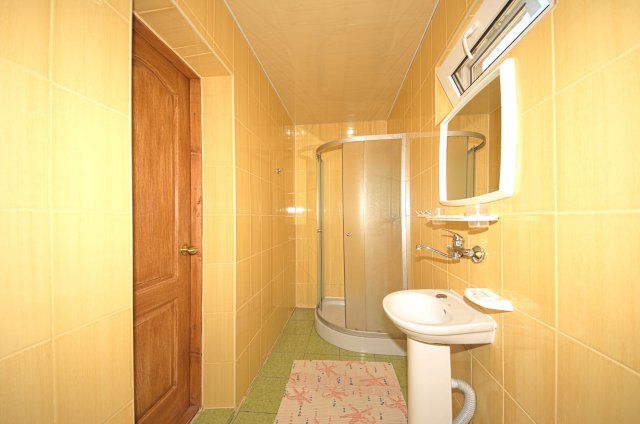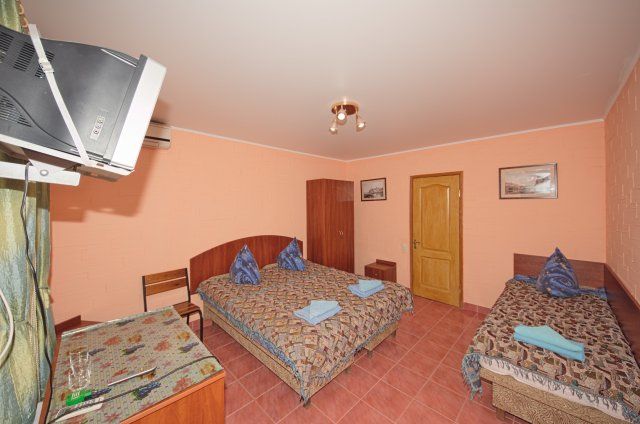 Стандарт 3-местный. Площадь 14-16 кв.м. В номере три раздельные кровати, все удобства (душ, умывальник, туалет), горячая и холодная вода, холодильник, телевизор, кондиционер. Уборка номера один раз в три дня. 6 номеров, расположены на 2 этаже. Размещение в номере: по умолчанию две вместе стоящие стандартные кровати + отдельно стоящая третья кровать