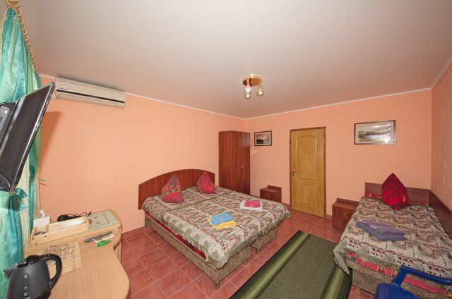 Люкс 3-местный. Площадь 35-45 кв.м. В номере одна разделенная на две жилые зоны комната. В номере двухспальная кровать, два односпальных раскладывающихся дивана, все удобства ( душ, умывальник, туалет), горячая и холодная вода, фен, комплект посуды, электрочайник, холодильник, телевизор (ЖК), кондиционер. Ежедневная уборка номера. Вода бутилированная, мыло, шампунь-гель (при заезде). 3 номера расположены на 1 этаже и 2 номера на 2 этаже. Размещение в номере: двухспальная кровать и раскладывающийся одноместный диван, за отдельную плату дополнительное спальное место на втором раскладывающемся диване