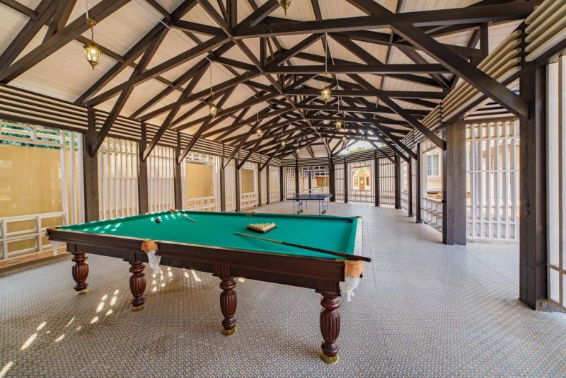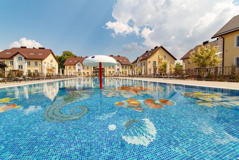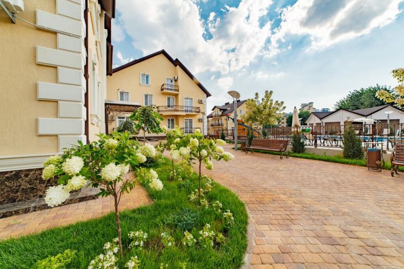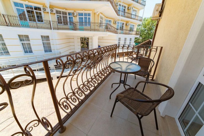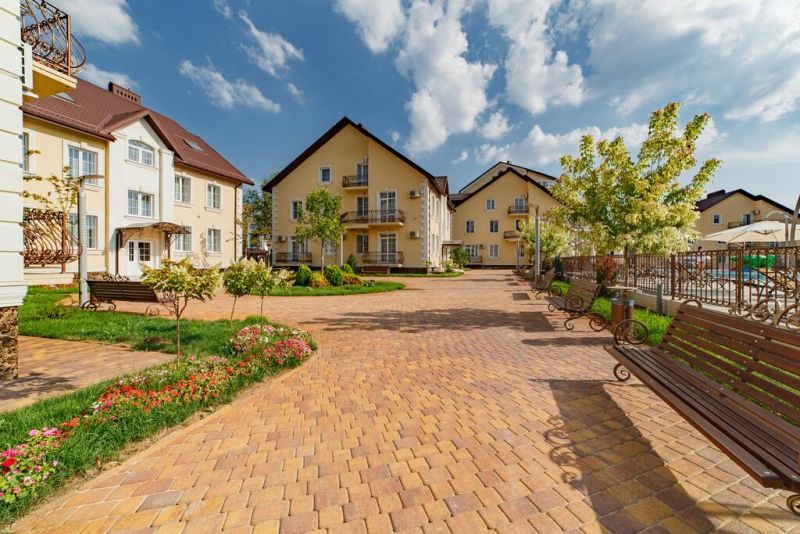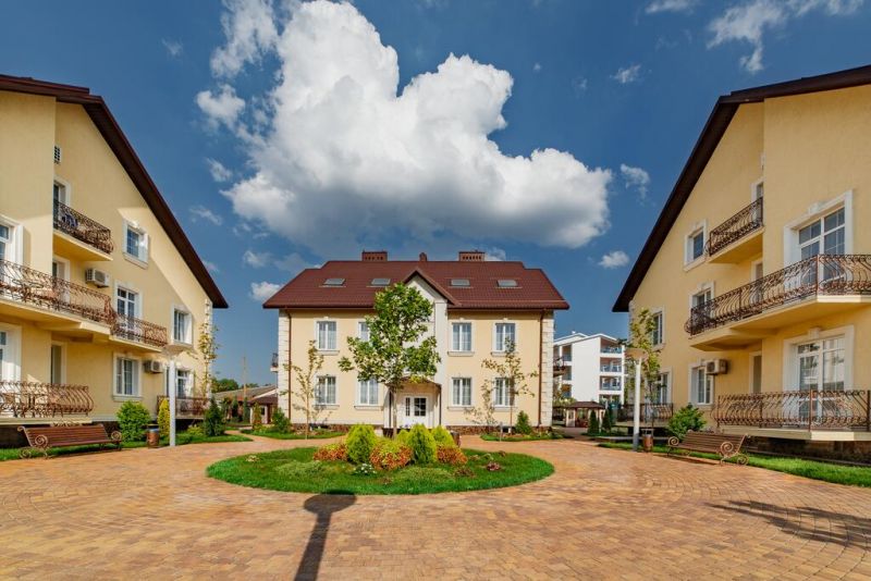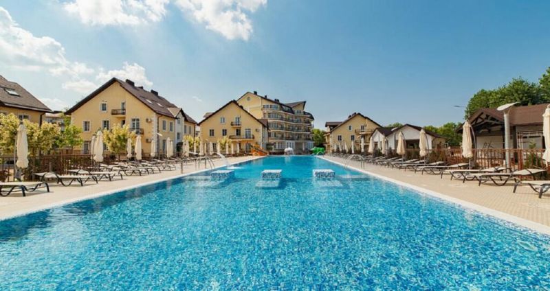 На территории расположены 8 трехэтажных коттеджей для размещения отдыхающих. И основное 5 этажное здание, где расположены служба приема и размещения, лобби-бар, ресторан со «шведской линией». Все номера в усадьбе повышенной категории, оформлены в нейтральных пастельных тонах.