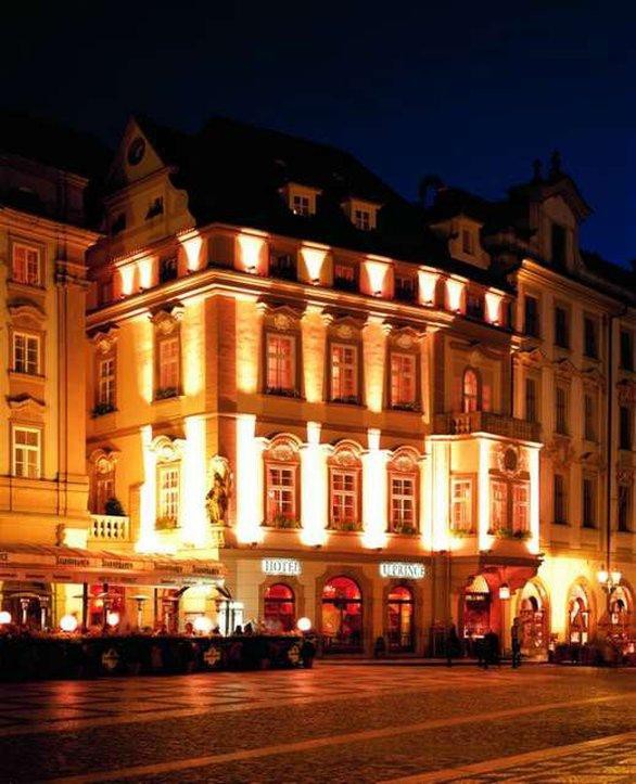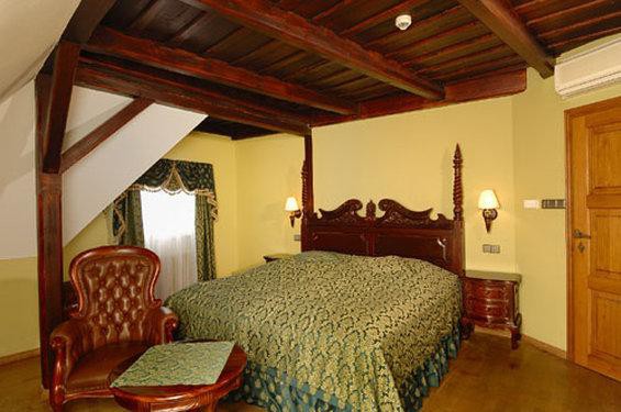 Suite (спальня и гостиная, облицованная мрамором ванная комната с входом из спальни, вторая спальня с входом из гостиной, очень большая кровать с балдахином, рабочий стол с компьютером, балкон с видом на Староместскую площадь)