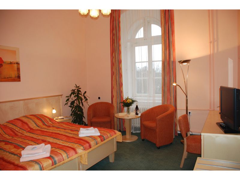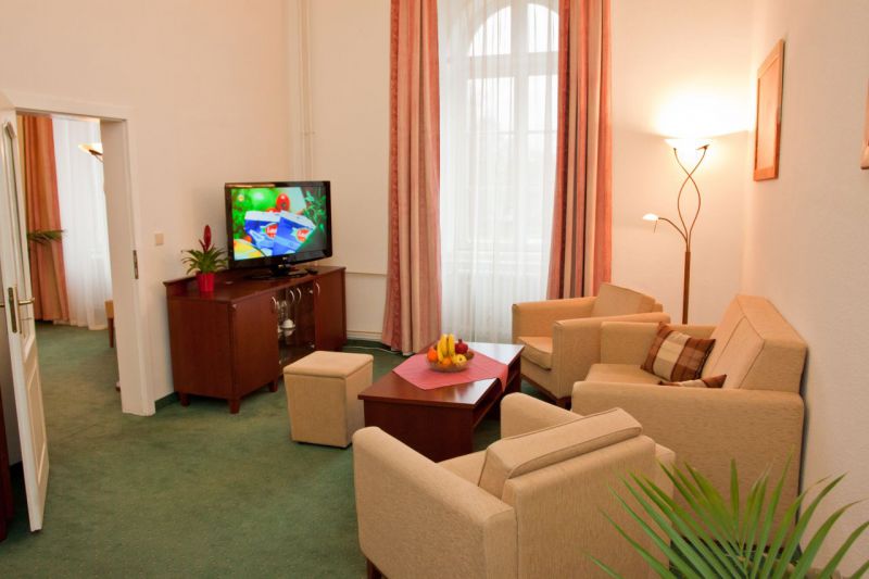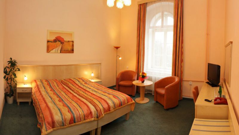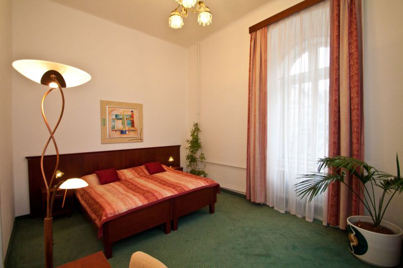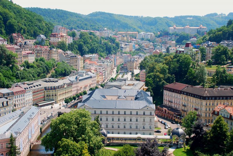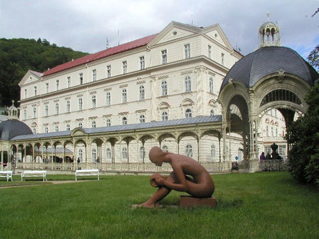 В курортном центре, на берегу реки Тепла, рядом с парком Дворжаковы сады и Садовой колоннадой.