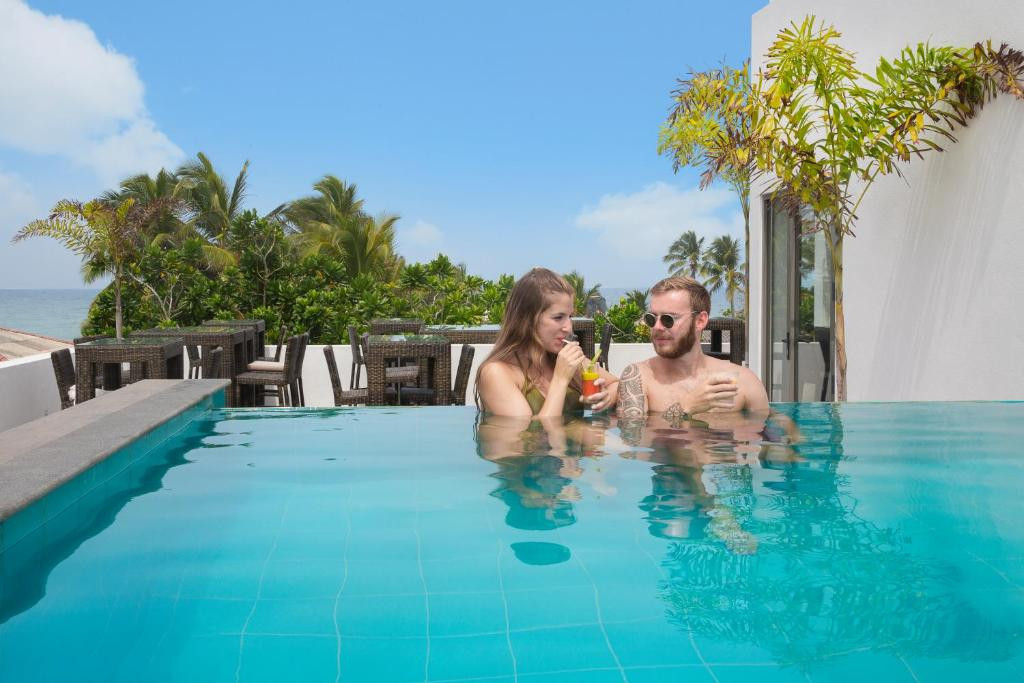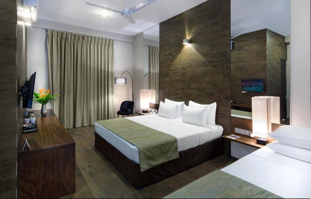 Отелем остались очень довольны . Состоит он из 2 жилых этажей , на 3 бассейн . Номер новый , уютный , все есть . Убирались каждый день . Завтраки вкусные . При выходе из отеля справа сразу обмен валюты , супермаркет и магазин с алкоголем( в маркетах его нет) . Пряж через дорогу . Чуть пройти направо -черепаший пляж , налево кафешки . За 300-400 рупий и 5 минут можно доехать на тук туке до рыбного рынка . Там же и фрукты/овощи . Килограмм огромных креветок примерно за 2500 рупий . Готовят там же за 300-500 и упаковывают с собой . Можно взять это всё и подняться на крышу отеля . На ресепшен можно попросить для этого дела тарелки , стаканы . Так же потом приходит сотрудник и всё убирает . Мы оставляли ему чаевые 150/200 рупий . Так же оставляли за завтраком и за уборку . Они молодцы , стараются , всегда вежливые . Так же по левую сторону от отеля магазины чая , 2 мини маркета , сувениры как вправо так и влево . Выбирайте его , не пожалеете )
