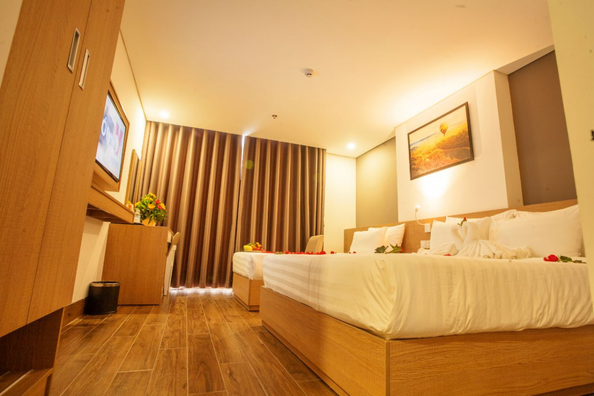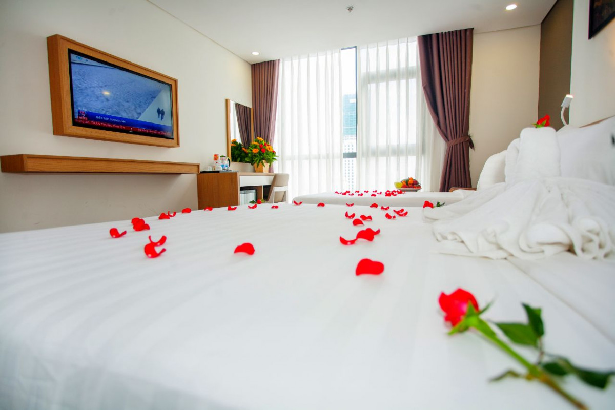 Отдыхаю в этом отеле сейчас, завтра крайний день. Пои заселении попросила поменять номер, т.к. постельное, мне показалось грязным, тут же поменяли на другой, только спросив причину. Отель понравился, не большой, 15 этажей, но из моего номера на 9 этаже море видно, хотя не первая линия. Море очень близко. Сам отель у дороги не видно, вначале путалась как найти, но потом привыкла. Номер не большой, метров 12, наверное. Уборка и смена полотенец каждый день. В номере холодильник, фен чай, кофе, вода, добавляют. Вода горячая, кондиционер работает, пляжные полотенца каждый день под запись в тетрадке. Завтрак хороший, голодным не будешь. Суп Фо бо, омлет, рис, макароны, овощи свежие чай, кофе, 2 фрукта, сок. Расположен отель в центре туристической зоны. Если приеду снова во Вьетнам, буду рассматривать этот отель.