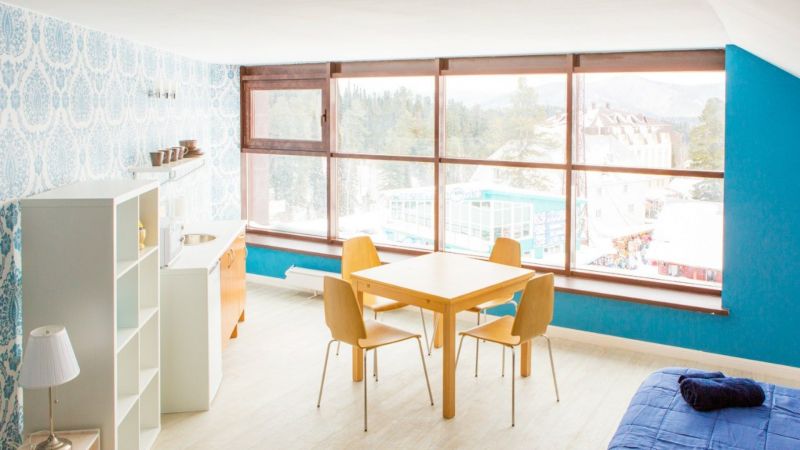 Отель прямо на выкате трасс сектора А, рядом с подъемниками, пунктами проката, барами и кафе, в самом центре горы Зеленая.
