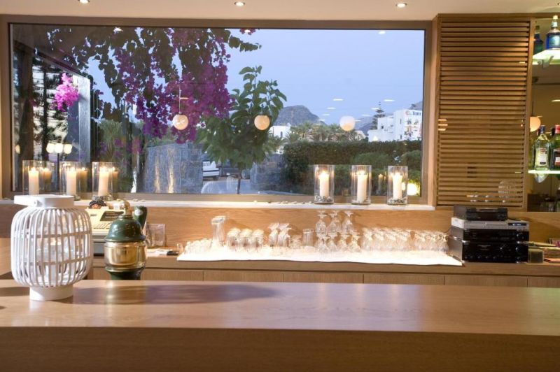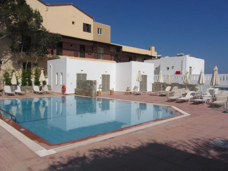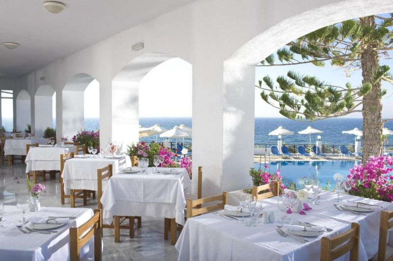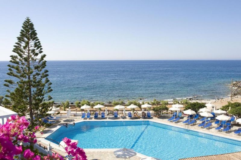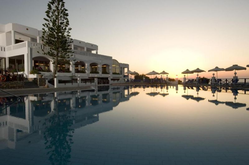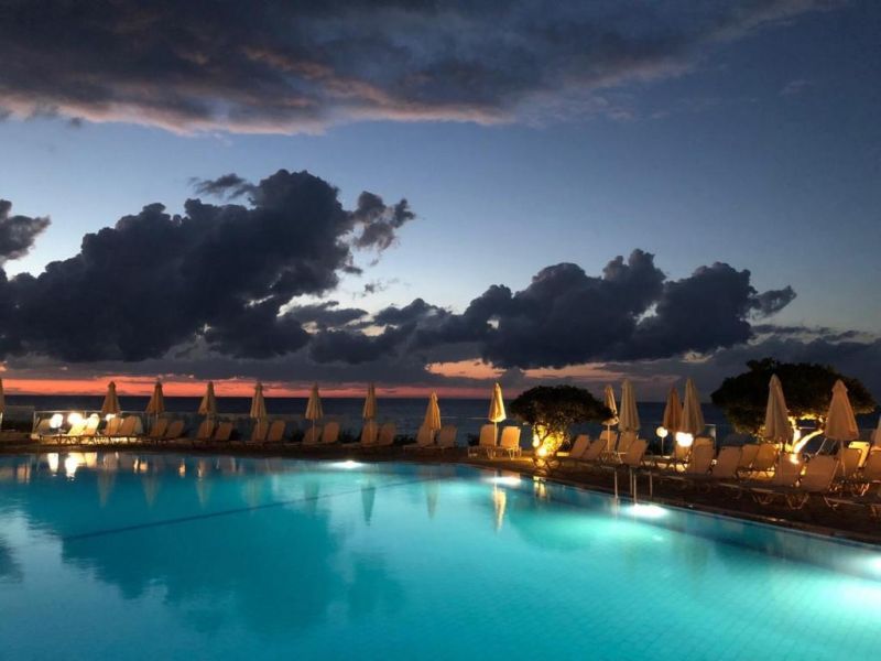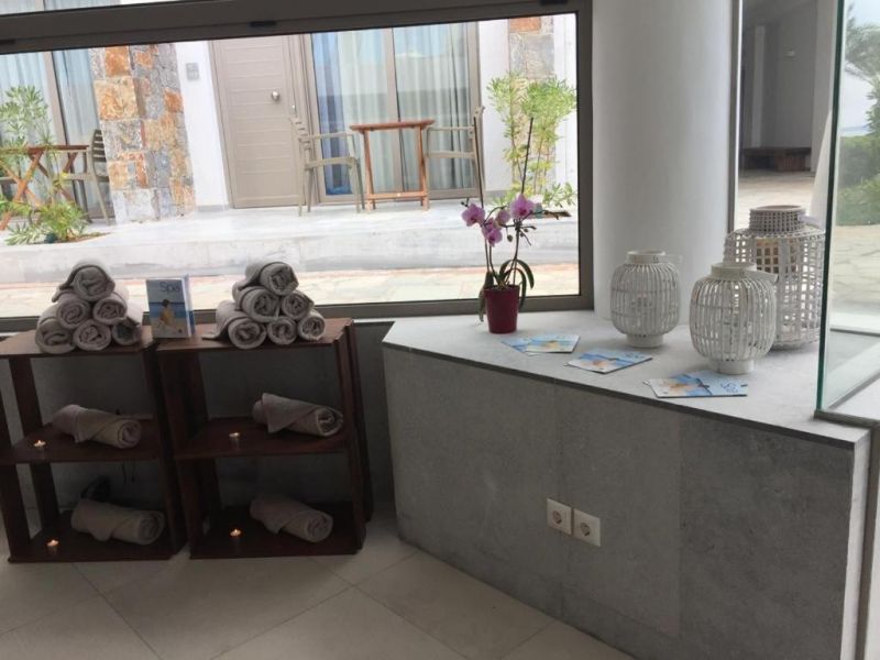 песчаный пляж в 200 м от отеля, рядом с отелем - скалистый берег