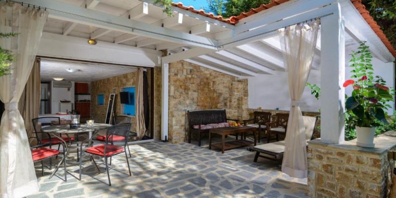 Villa Dimitra (~120 кв.м, салон, каменный камин, 3 спальни, оборудованная кухня, 2 ванных комнаты (с душем), большая веранда, отдельный бассейн (45 кв.м.), пульт управления внешними воротами, паркинг для 1 машины. Возможное размещение - до 4 человек)