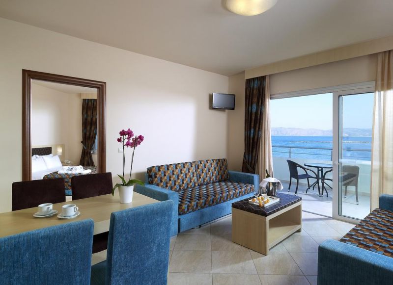 Отдыхали в этом отеле семьёй с 15 июля по 25 июля. Отель выше всяких похвал. Номер очень хороший, всё продумано до мелочей. Кондиционер расположен над входной дверью и дует параллельно кроватям, а на них. Выключается автоматически, как только вы откроете балконную дверь. Балкон просторный со столиком и креслами. На балконе выдвижная сушилка для белья, причем расположена сбоку и не мешает. Нам дали номер на третьем этаже с видом и на море, и на гору. У нас в номере была двуспальная кровать с ортопедическим матрасом и диванчик, на котором спал сын. Бельё новое и менялось часто, полотенца меняли каждый день. В номере убирались тоже каждый день и очень хорошо. Всегда ждали, когда мы покинем номер, не ломились, как это было в других отелях. Обслуживание превосходное, очень приветливый персонал. Отель расположен с выходом на пляж, зонты и шезлонги бесплатно. По пляжу ходит персонал отеля, и вы можете заказать себе какой-нибудь напиток. А ещё плюс отеля в том, что ресторан работает дольше заявленного времени. Мы пару раз опоздали на ужин минут на 20, но всё-же смогли поесть. В других отелях с таким не сталкивались. На Крите мы отдыхали третий год и из всех отелей, в которых мы проживали, этот лучший.