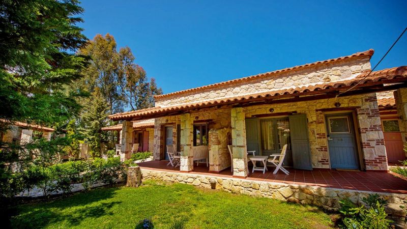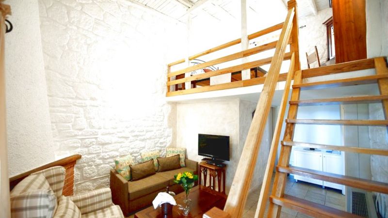 Maisonette Deluxe 2-Bedrooms (~50 кв.м, это двухуровневый номер. На нижнем этаже гостиная с диван-кроватью и спальня, на втором этаже спальня (без двери). Веранда, сейф, душевая, халаты)