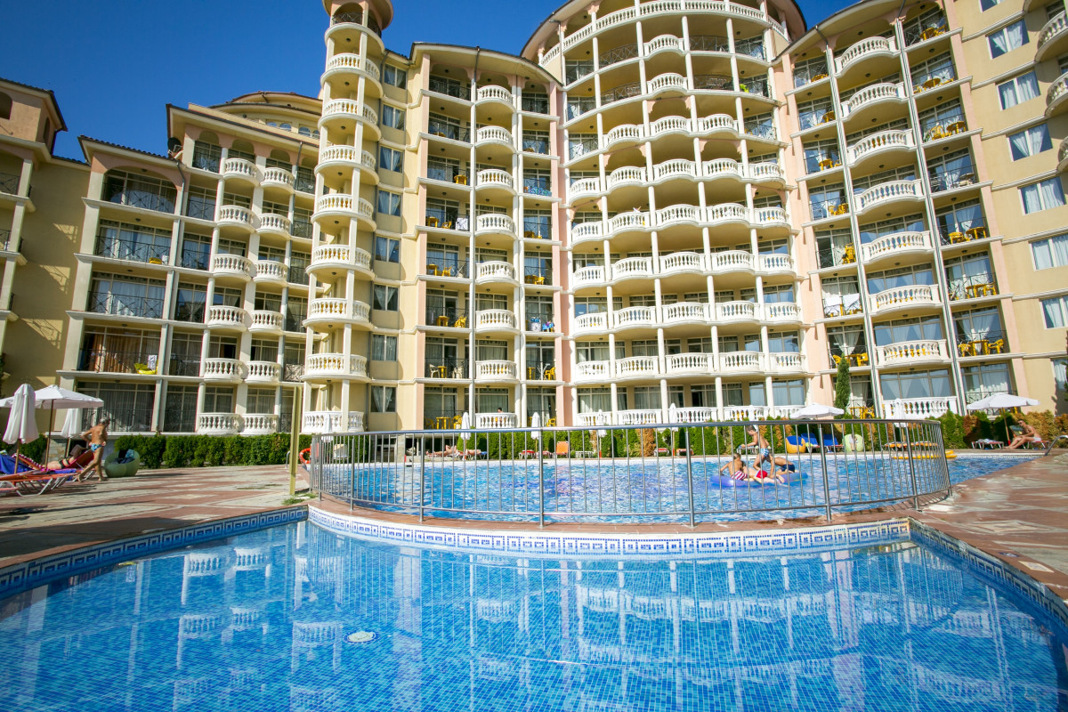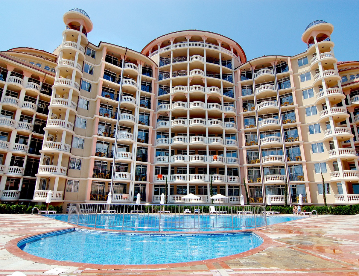 в курортном комплексе Елените, в 40 км от аэропорта города Бургас, в 9 км от курорта Солнечный Берег, на самом берегу моря.
