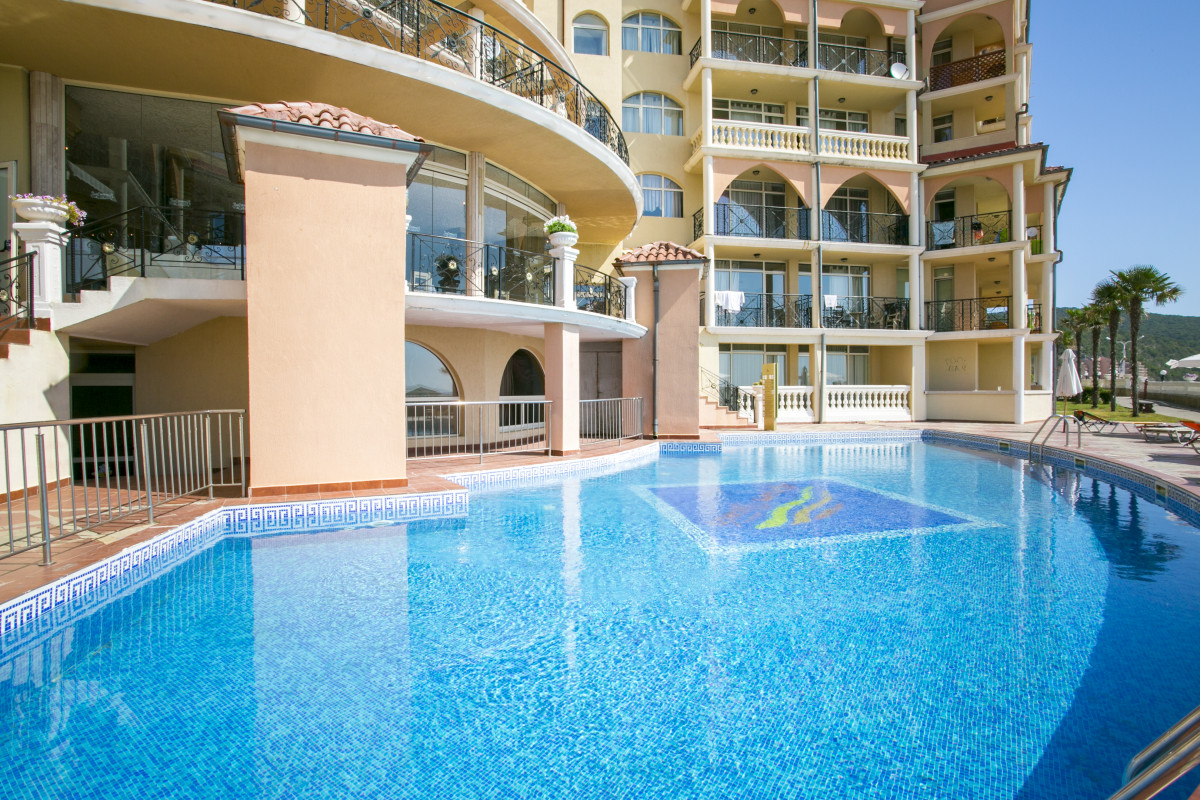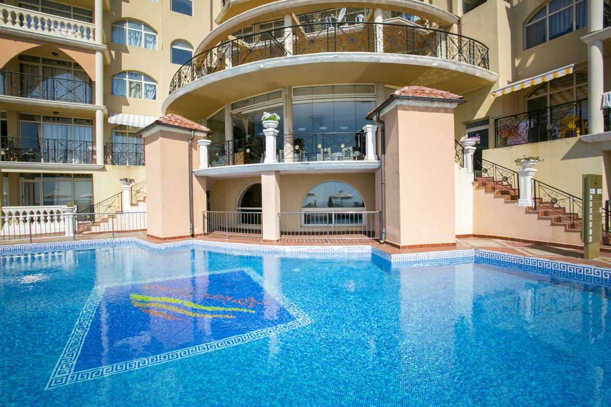 Отличное расположение отеля на закрытой территории в городке Елените. Отличное питание, комфортные номера. Возле каждого отеля бассейн с пресной водой. По большой огражденной, комфортной, отлично оформленной территории гуляют и ходят только проживающие и обслуживающие. Это в отличии от других курортов Болгарии, где тучи народа. Замечательная и огромная детская площадка с каруселью, бассейном, территорией развлечений. Большое количество питательных, и воду и напитки представляющих, точек по всей территории. Некоторые работают до поздней ночи. Торговый центр с большим количеством магазинов за забором. Душевные развлекательные программы и на территории и за забором. Пляжи песочные, есть и ВИП-зоны. Все это благодаря руководству всего комплекса отелей.