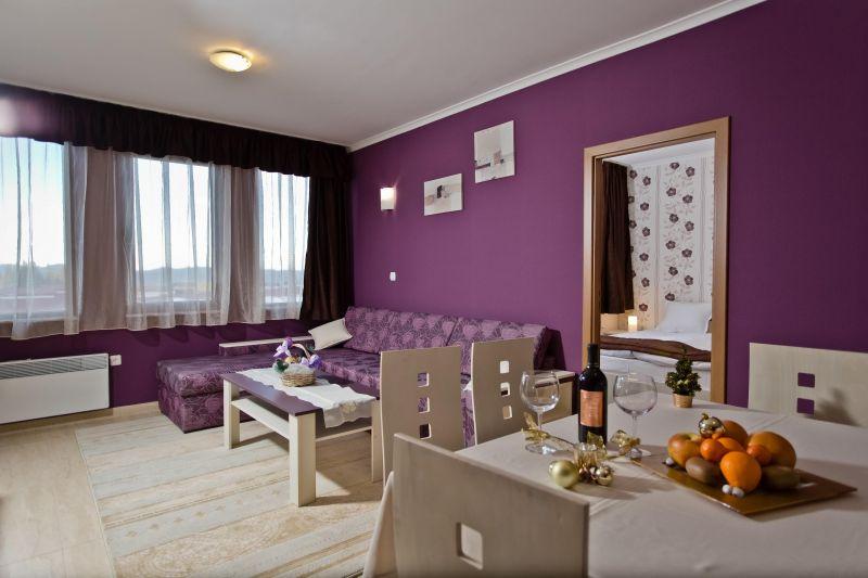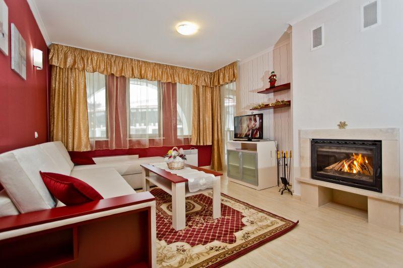 В отеле есть свой пункт проката и горнолыжная школа, а также бассейн и сауна. Готовить можно самим в номерах (они оборудованы кухонным уголком) или же посещать рестораны на территории, среди которых есть и “механа” с национальными блюдами. И еще одна интересная деталь: в номерах есть камины.