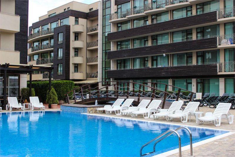 В курортном комплексе Солнечный Берег, в 25 км от аэропорта города Бургас, в 1,5 км от центра курорта, в 350 м от моря.