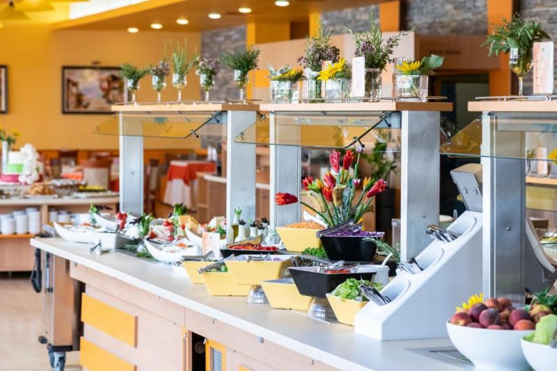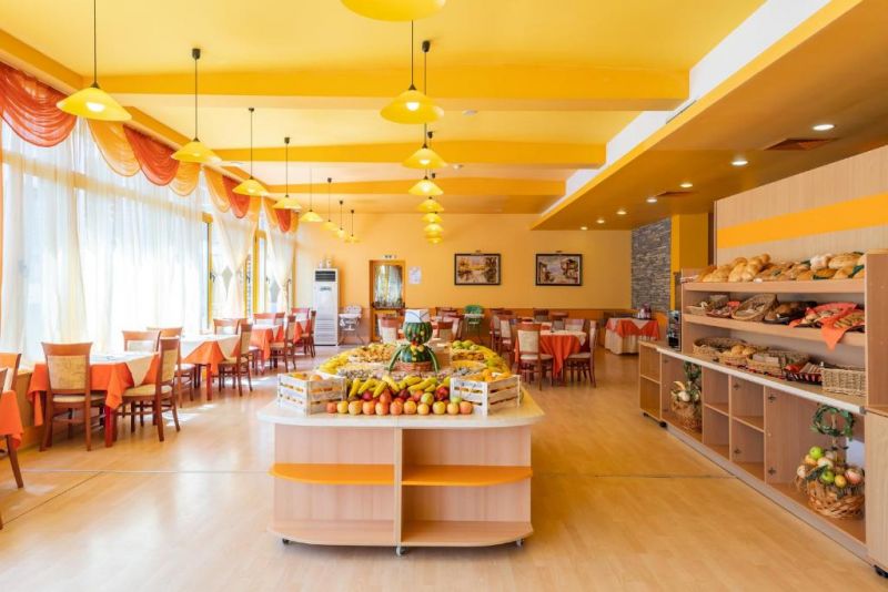 - международная кухня, включая широкий выбор свежих салатов и блюд. Широкий ассортимент фруктов и десертов. Безалкогольные и слабоалкогольные напитки. Место для курения находится на террасе ресторана вместимостью 48 человек.
