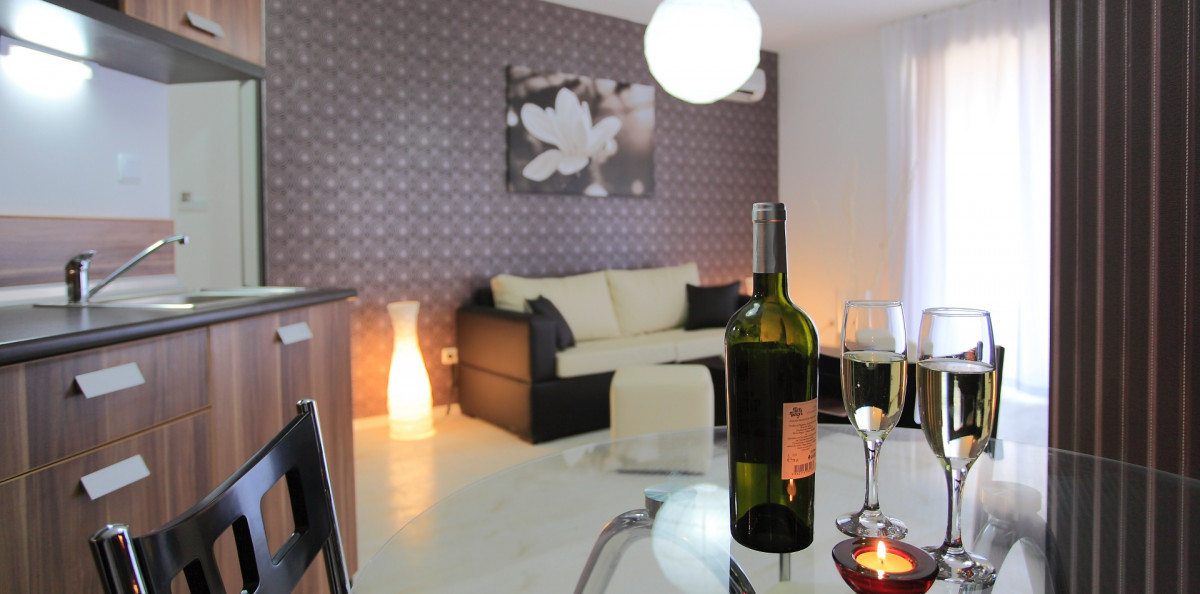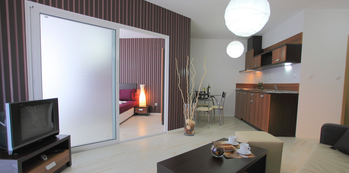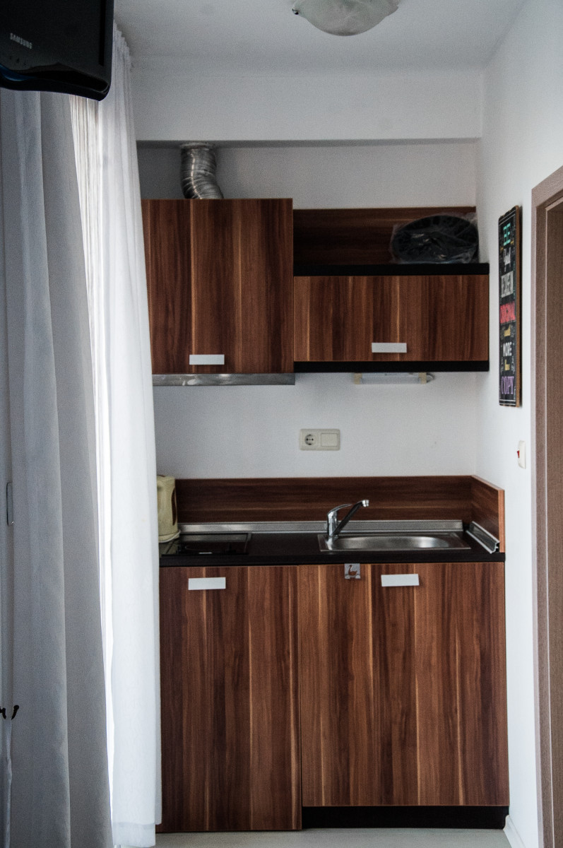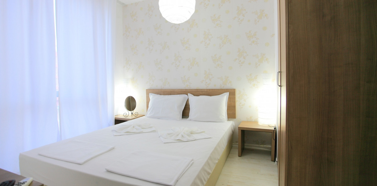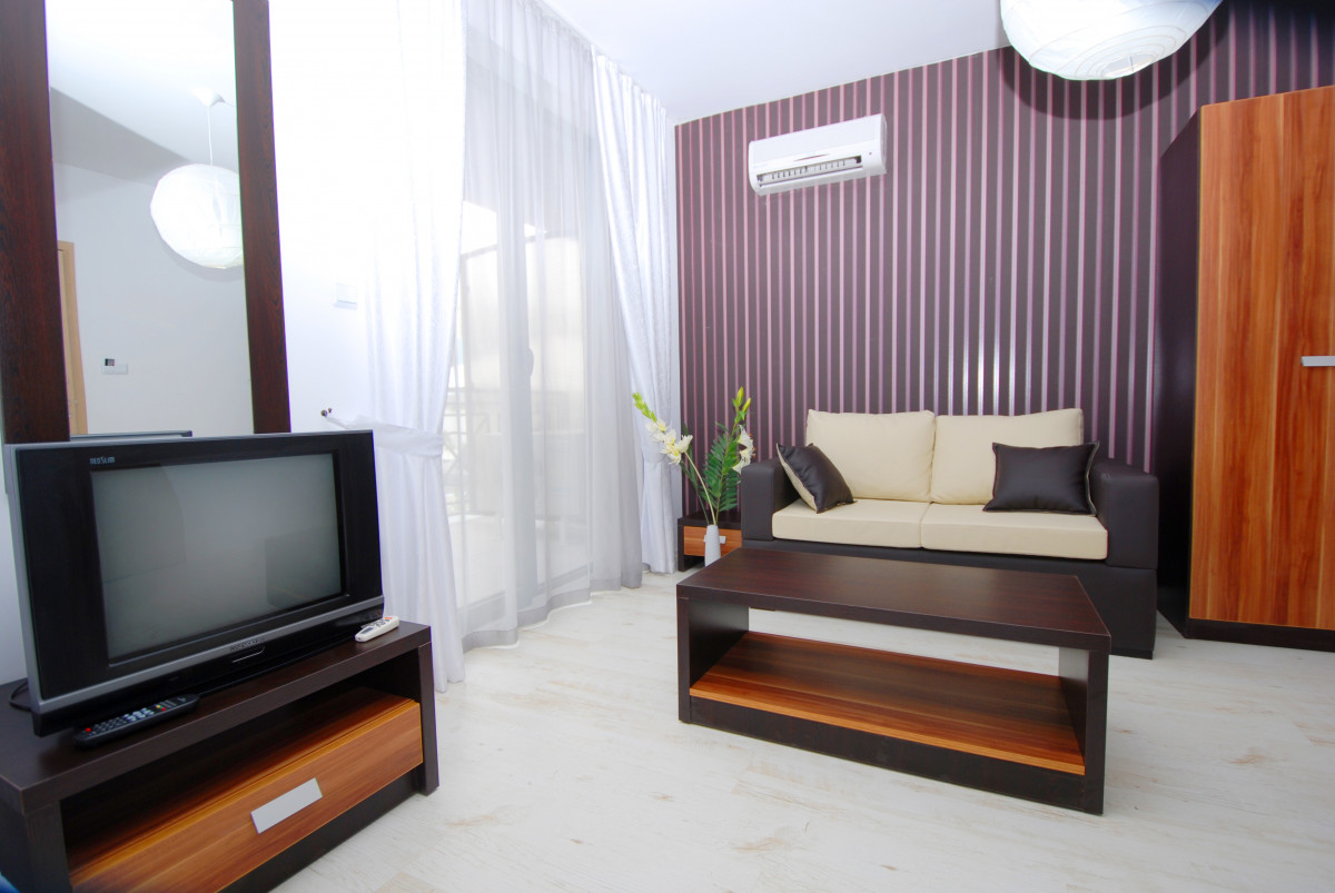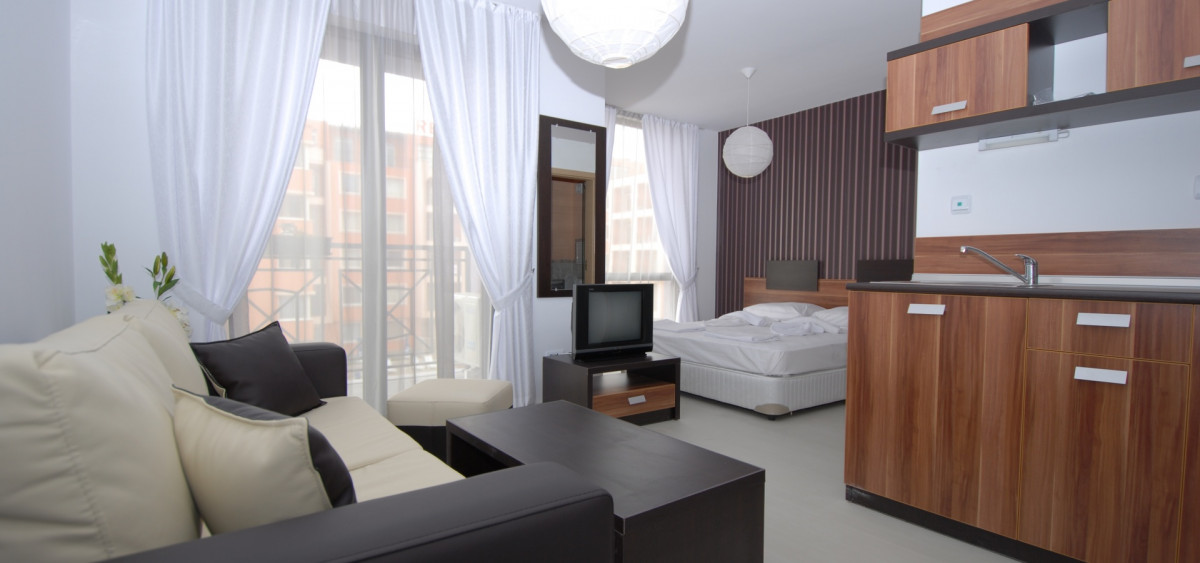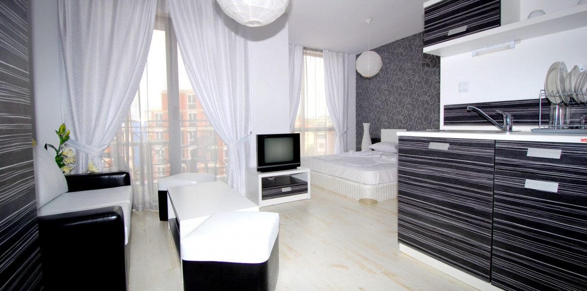 - Studio Deluxe - максимальное размещение 1 взрослый + 1 ребёнок, 2 взрослых + 1 ребёнок или 3 взрослых (однокомнатные: с зоной гостиной, две односпальные или одна двуспальная кровать, раскладной диван, зона кухни - плита, холодильник, электрочайник, посуда и приборы, 35 кв.м.)