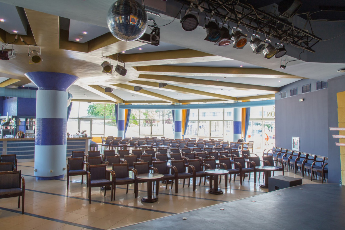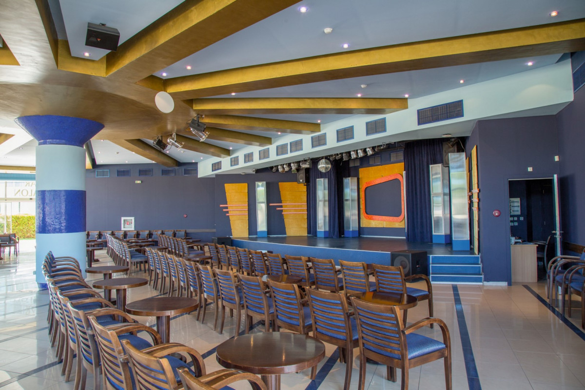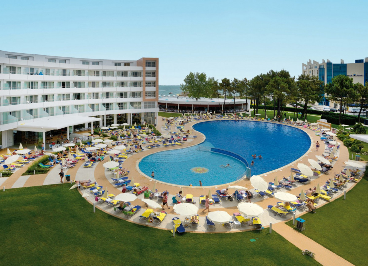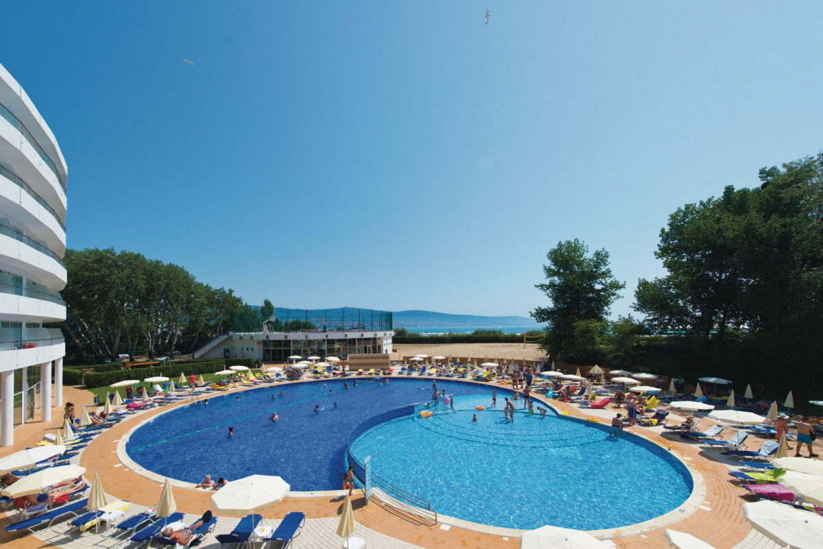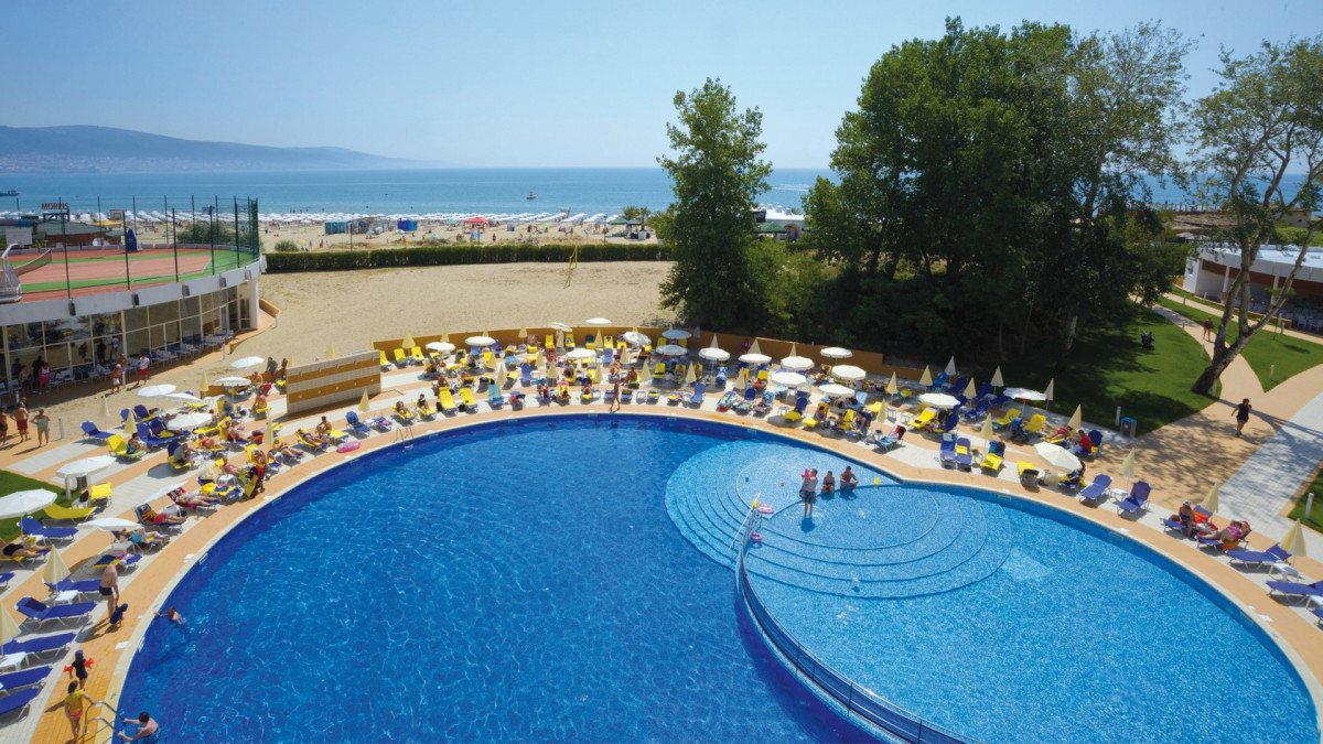 В курортном комплексе Солнечный Берег, в 25 км от аэропорта города Бургас, в 300 м от центра курорта, на самом берегу моря.