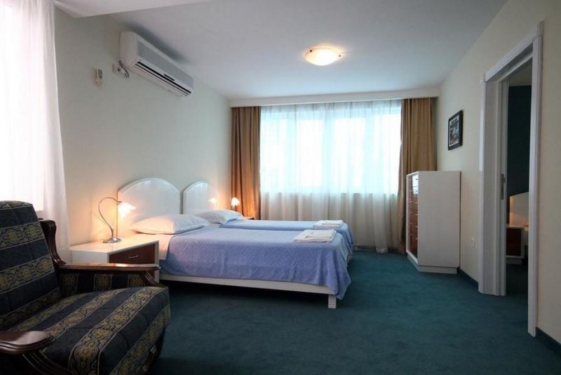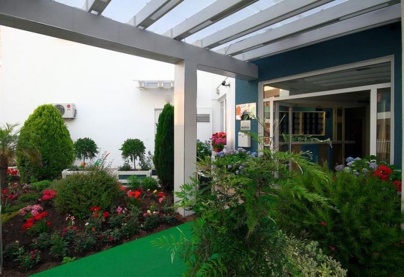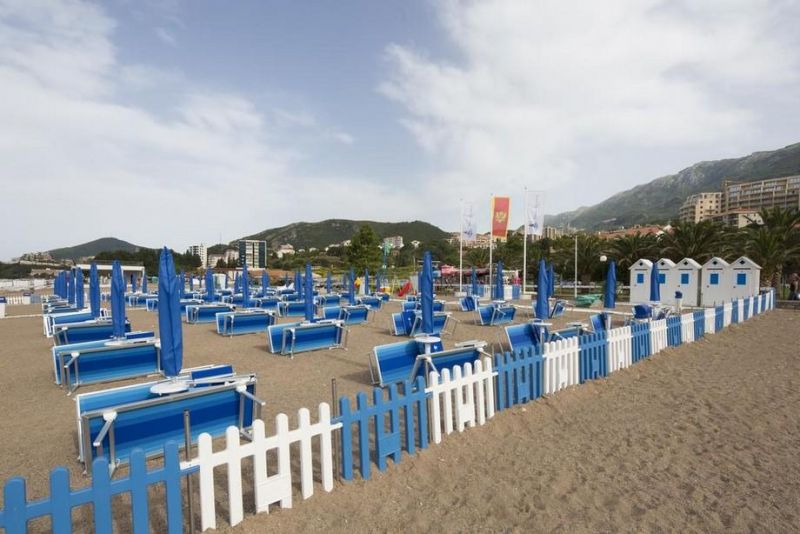 Собственный участок (длиной 63 м и шириной 40 м) на песчаном пляже курорта Бечичи - в 100 м от отеля, через дорогу. Стоимость комплекта 2 шезлонга + зонт: около 10 евро в день в июле и августе и 8 евро - в сентябре. Пляжные полотенца - 1 евро/в день.