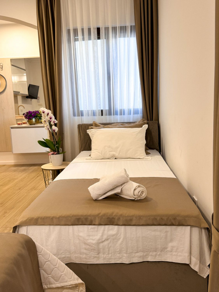 Studio 3 Pax — 25 кв. м, двуспальная и односпальная кровати, мини-кухня, балкон. Число гостей — до 3 человек