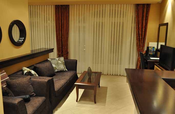 Superior One Bedroom Apartment (Main Building, 45 кв.м, вид на море, спальня с двуспальной кроватью, гостиная с диваном-кроватью для 2 человек и мини-кухней)
