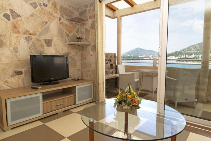 Apartment 04+2 SV — 60 кв. м, в номере с видом на море одна двуспальная кровать и две односпальные, диван и раскладное кресло, кухня, стиральная машина, две террасы. Максимальное размещение — 6 человек