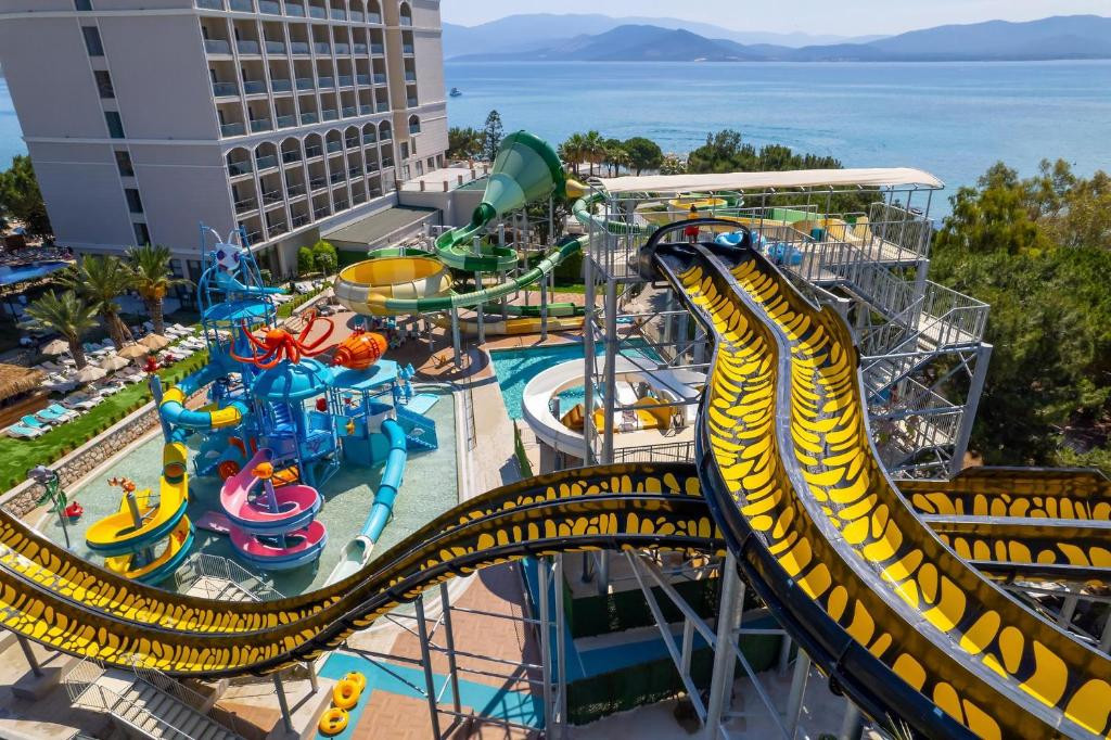 Лень было писать отзыв, но достойный отель, жаль если рейтинг упадет))) Отдыхали в июне 2024. Чистейшее море (у отеля на входе 1,5 м камешки, потом прекрасный устойчивый песок, рыбки под ногами, крабы и осьминоги в камнях, рядом с отелем песчаный пляж, но там много людей, поэтому мы предпочитали камни, ну и пирсы в вашем распоряжении), прекрасное питание (практически круглосуточное, всегда где то что то есть поесть, тут не то что с голоду, выжить бы от количества, и мороженое на баре у пирса - безлимит в радость детям) и вкусно и разнообразно ( и мясо и птица и рыба, и фрукты и овощи, и сладкий стол на любой вкус, к алкоголю нет претензий), официанты хоть по русскому ни слова, всегда пытаются помочь, да и управляющий бдит! )) Не понимаю откуда у людей столько претензий по питанию. Заплатила 142 т. из Москвы за 9 полных дней. Омаров не подавали, но очень хотелось )))))))))) Очень отзывчивый персонал (Алине отдельное спасибо -решала все вопросы оперативно и четко). Я вообще такой клиентоориентированности давно не видела. В номере убирались ежедневно, полотенца тоже меняли ежедневно. Полотенца новые, пушистые что в номерах, что пляжные. Аквапарк и для взрослых и для детей ( по часам , но на мой взгляд более чем достаточно). Территория для прогулок вполне. Анимация меня не особо интересует) Поэтому твердая 5 ка! Из минусов (не считаю их отельными) пожалуй то, что за отелем - ничего ничегошеньки, но и это решаемо, 50 рублей, 15 минут и вы в Дидим, а там и пройтись можно среди толп туристов и храм Аполлона посетить ( рекомендую , история))) А вот на водные виды спорта обратите внимание в плане передачи денег, будьте бдительны, была неприятная ситуация. (но это наверное тоже минус не к отелю)