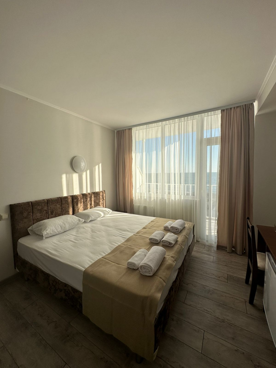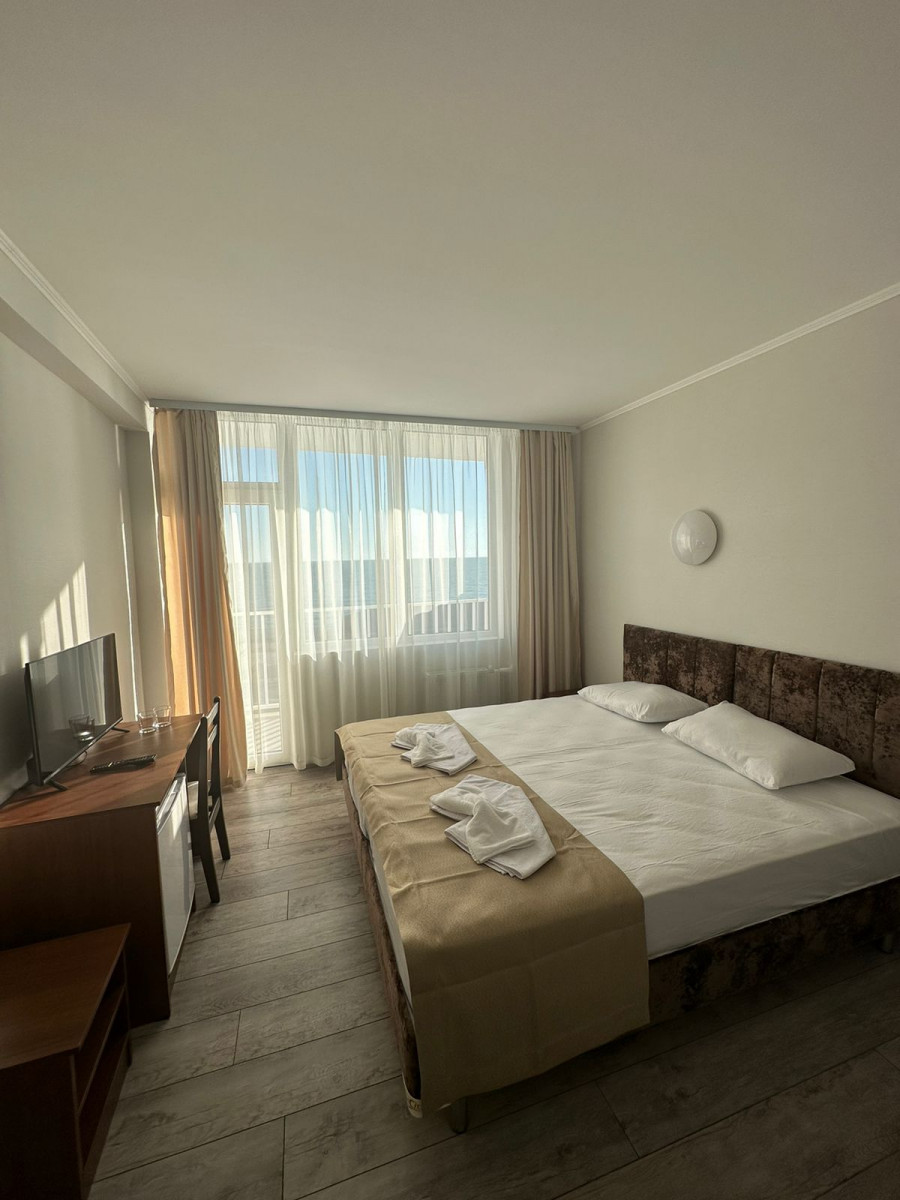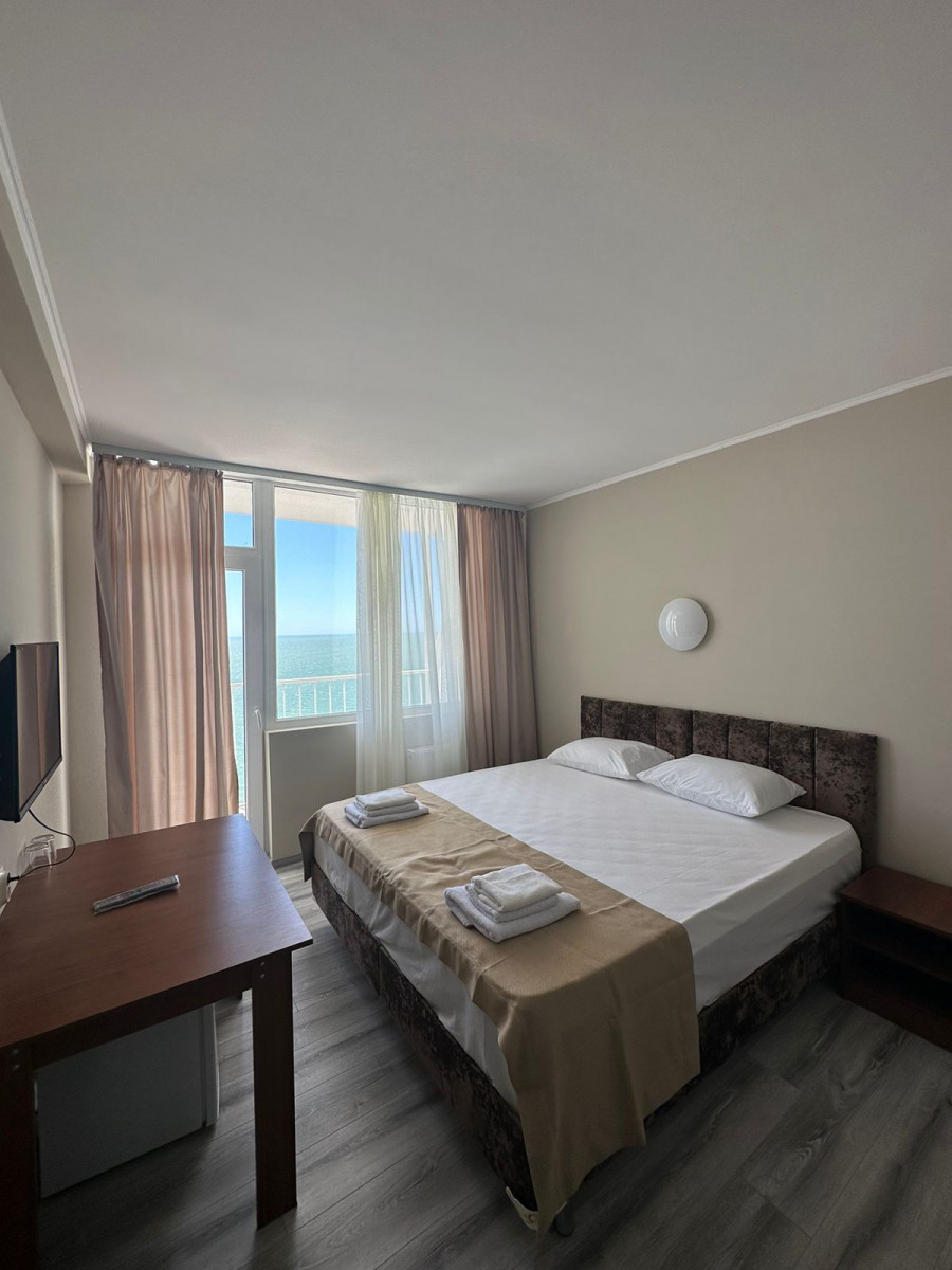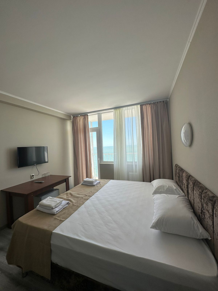 Отель , обо всем по порядку: 1. Первая береговая, отличный вид из окна(у нас на море, 10 этаж, всего 16 этажей) 2. Все номера с балкона и, просторные. В номере двухспальная кровать, стол, стул, два табуретка, прихожая!, телевезиров, кондиционер, холодильник, санузел. Номера убирают каждый день, на каждом этаже своя горничная. 3. Еда: шведский стол, 3 вида гарниров, 3 вида салатов, 3 вида мяса, 2 вида десертов, напитки: вода, морс, чай, кофе, молоко. Голодными точно не останетесь! 4. Персонал доброжелательный, всегда помогут, услуги не навязывают 5. Местные тоже стараются, чтоб отдохнули хорошо, всегда спрашивают, нравится ли вам у нас, всегда готовы придти на помощь. 6. Wi-Fi работает, на территории отеля, до моря хватает Единственная проблема-это трансфер до отеля, но если вас не пугает дорога, то можете смело планировать отдых, лично мы забыли про этот минус, оказавшись в холле отеля) Всем приятного отдыха!